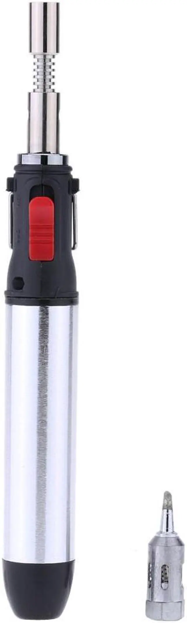 Specifications: Color: Silver + Black Material: Plastic Filling Capacity: 12ml Flame Temperature: 1300C Solder Iron Temperature: 450C Use Time: 50-80 Minutes Weight: 63g / 2.22oz Dimensions: 1.9 * 16.7cm / 0.75 * 6.57in (Dia. * H) Package Size: 19.7 * 8 * 2cm / 7.75 * 3.15 * 0.79in (L * W * H) Package Weight: 78g / 2.75oz Features: Pen style design is unique, generous and elegant. High capacity and excellent performance. Easy for ignition, quick heat and durable use. Compact size, lightweight and portable to carry. Use gas as its power without voltage and wire limitation. Can be used as ordinary soldering iron, heat gun or flame gun, very practical. Metal handle features high texture and fine hand feeling.Note: The product is not filled with gas yet, please refill it before use.