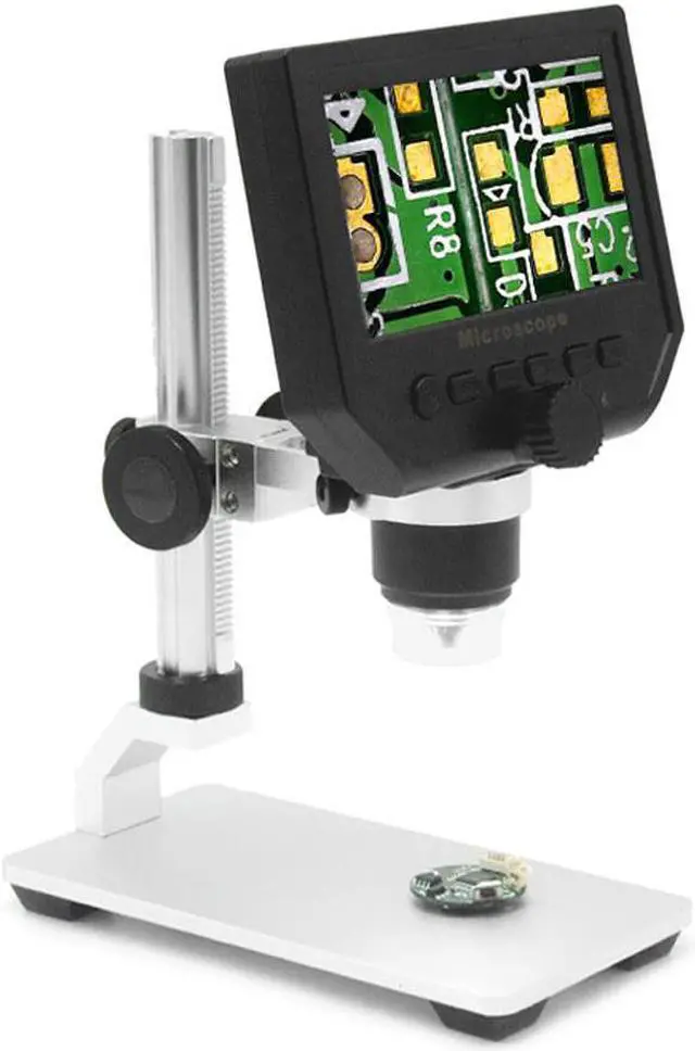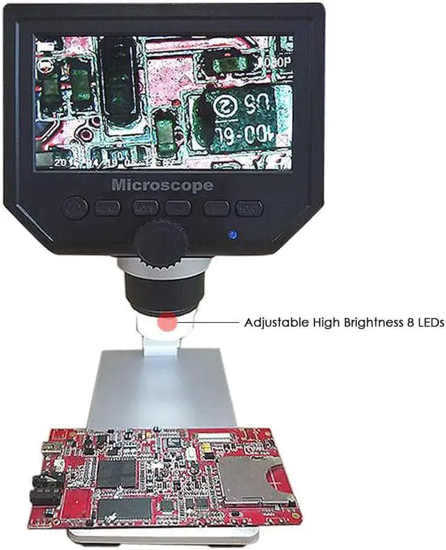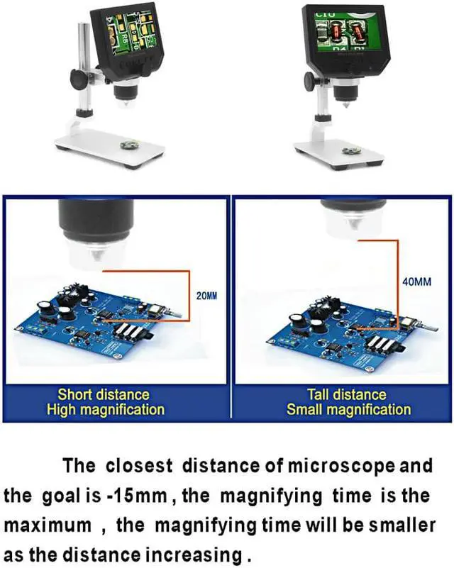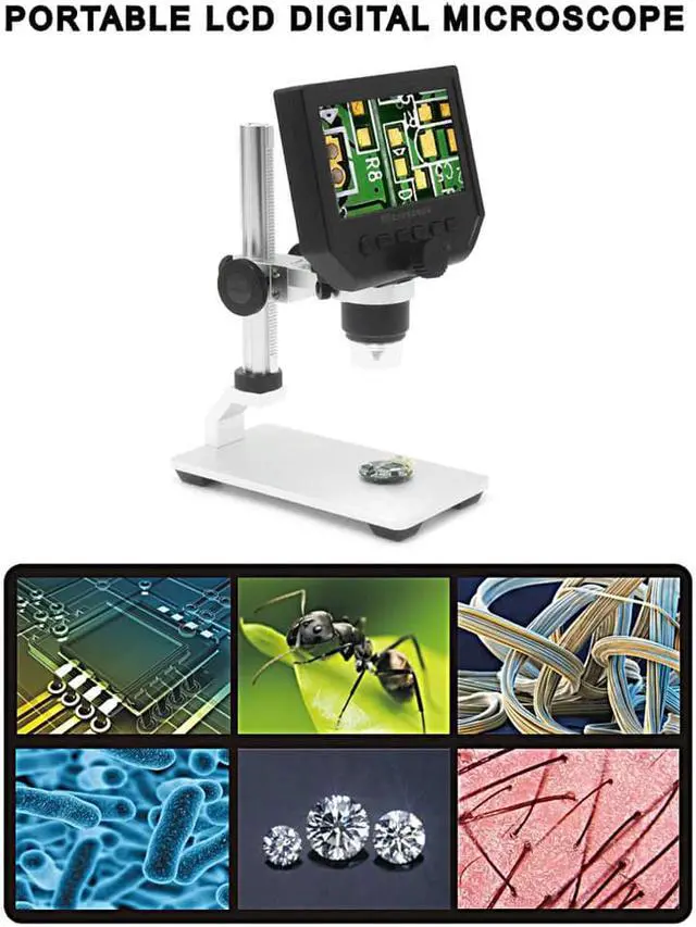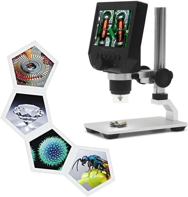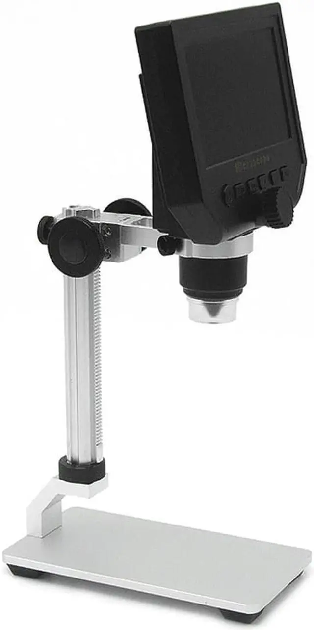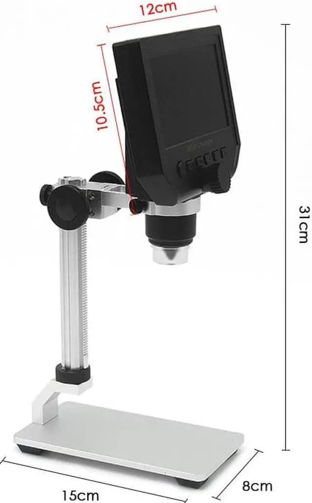 Function Setting Key:Resolution: 1080P, 720P, VGA Date Tag: displayed /not displayedMotion Detection: ON/OFF (When it's on, it will start to record a video automatically, as soon as detecting something's moving.)Cyclic Record: off / 3 minutes / 5 minutes / 10 minutes (If the memory card is full, it will delete the first video and save the new video automatically.)Exposure Value: +2.0 (0) -2.0Format: Yes/NOLanguage: 16 kinds of languagesAutomatic Shutdown: off, 1 minutes, 3 minutes,Automatic Turn off the LCD: off, 1,3,5 minutesFactory Reset: Yes/NoLight Source's Frequency: 50HZ, 60HZTime Setting: year, month, day, hours, minutes, secondsImage Rotating: on/offLight: on/offSoftware Version: V1.10Mode Button:Recording Video ModeTaking Photos Mode: (5M, 2M, 1.3M, VGA) press OK button for taking photosPlayback Mode: delete, lock/unlockButton: left button, right button, OK button(photo/video, open key)Specifications:Color: Black + SilverMaterial: ABS Plastic + AluminumPlug: EU / US / UK (Optional)Input Voltage: 110-240VPixel: HD 3.6MP CCDDisplay: 4.3in HD LCD DisplayMagnification: 1-600X continuous magnification systemObject distance: 15mm-infinity (depend on the different distance)LED Light Quantity: 8pcsBattery: Built-in 605080 lithium battery 3.7V, 2500mABattery Continuous Working: about 6 hoursCharging Time: about 4 hoursLanguages: English, Spanish, Russian, Korean, Japanese, Thai, Hebrew, Portuguese, German, French, Italy, Turkey, Czech, Poland, Traditional Chinese and Simplified Chinese(16 kinds of languages)Item Size: 15 * 12 * 31cm / 5.91 * 4.72 * 12.20inItem Weight: 530g / 18.70ozPackage Size: 20.5 * 16 * 8cm / 8.1 * 6.3 * 3.1inPackage Weight: 820g / 28.92oz 4.3 inch HD LCD display electronic microscope with 600X magnification, adjustable high brightness 8 LEDs, 16 languages and portable size, this digital microscope will help you see and analyze tiny objects in microscopic details. Built-in lithium battery can continuously work for 6 hours. Come with a metal holder to help support the microscope. Open the doors of the micro-world for you. Features:HD 3.6MP CCD provides you clear image and it helps you to see tiny objects easily with the professional microscopic lens.Built-in super lithium battery, can work for 6 hours continuously.4.3 inch LCD display, allowing you to instantly see all your observations in detail and providing you a view of 1080P/720P/VGA resolution. Supports 1-600X continuous magnification system, convenient & easy to use & carry. Adjustable high brightness 8 LEDs, available for working up to 100 thousand hours.The closest distance between microscope lens and the object is 15mm and the magnifying times will be shorter as the distance increasing.Wide usage: Mobile phone maintenance, QC inspection, education purpose inspection, industrial inspection, print industrial, jewelry & stamp(collections), textile industrial and biological inspection.