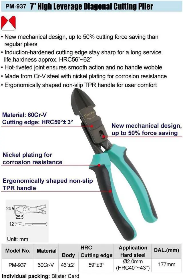 ProsKit PM-937 7" High Leverage Diagonal Tool Cutting Plier Wire Cable Cutter Side Cutting Pliers Multitool New mechanical design, up to 50% cutting force saving than regular pliersInduction-hardened cutting edge stay sharp for a long service life, hardness approx. HRC56~62Hot-riveted joint ensures smooth action and no handle wobbleMade from Cr-V steel with nickel plating for corrosion resistanceErgonomically shaped non-slip TPR handle for user comfort