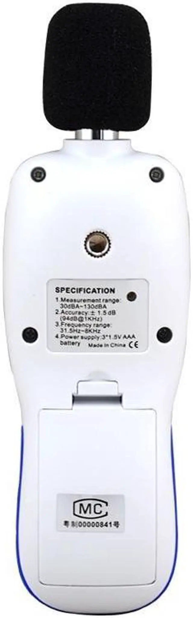 Specification: * Measuring range: 30dBA~130dBA * Accuracy: 1.5 dB * Frequency range: 31.5Hz~8.5KHz * Frequency weighting: A * Digital Display: 4digits * Resolution: 0.1dB * Sample rate: 2 times/second * AAA*3 Battery,not included * Operating condition: 0~40 10~80%RH * Storage condition: -10~60 10~70%RH * Weight: 144g * Dimension: 56.1*177*36.03mm Package Included: 1. 1 x Sound level meter 2. 1 x Operation Manual 3. 1 x Sponge Ball