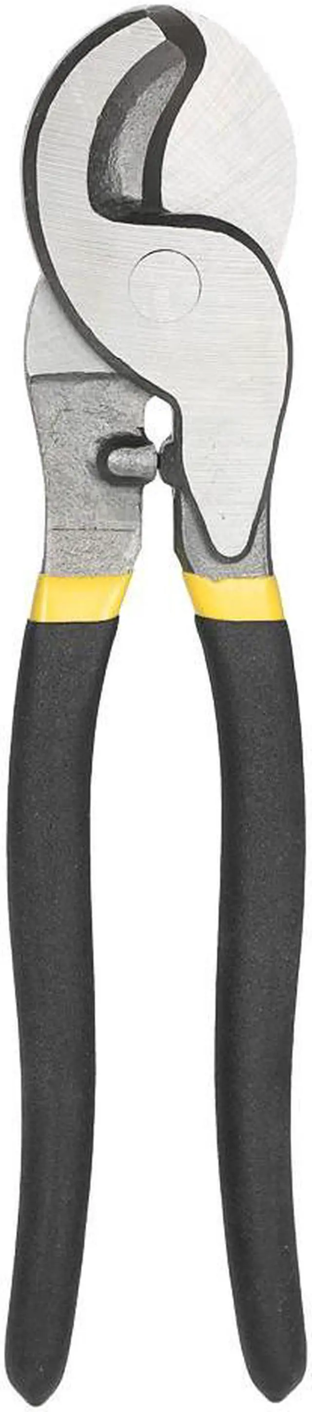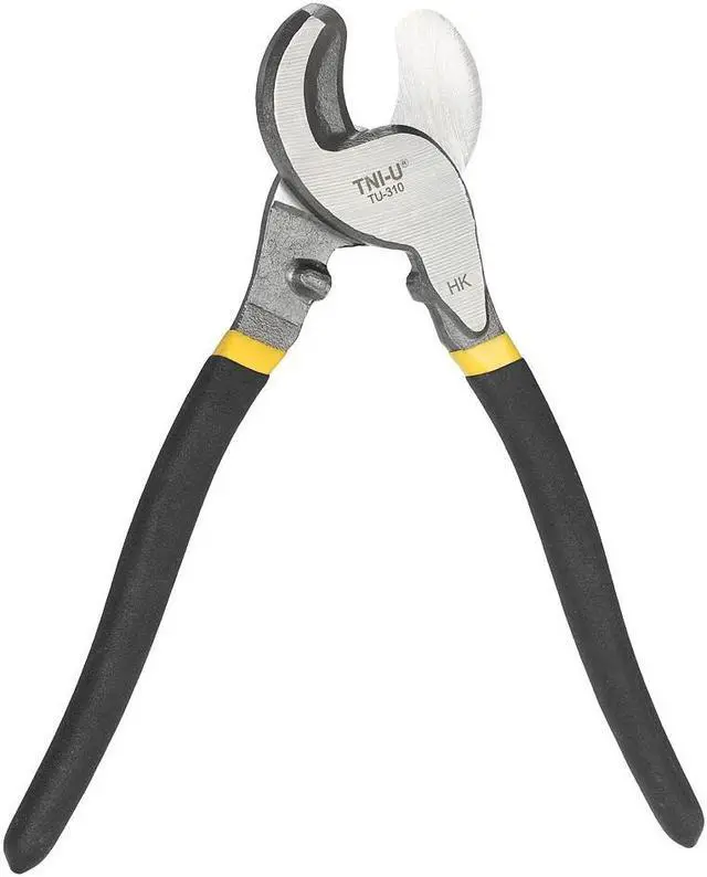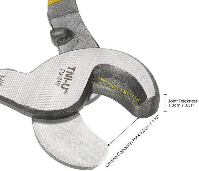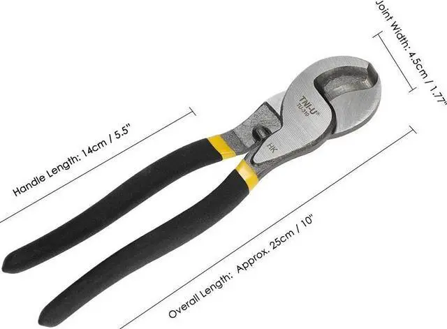 Specifications:Color: BlackMaterial: High-carbon Steel + PVCOverall Length: Approx. 25cm / 10"Cutting Capacity: Approx. 4.5cm / 1.77"Jaw Length: 3.5cm / 1.4"Joint Thickness: 1.3cm / 0.51"Joint Width: 4.5cm / 1.77"Handle Length: 14cm / 5.5"Product Weight: 440g / 15.54ozPackage Size: 32 * 9 * 2cm / 12.6 * 3.54 * 0.8inPackage Weight: 474g / 16.73ozNote:1. This is a non-insulating tool, please cut off the before use.2. It can not be used to cut steel wires and hard copper cables. Features:Used for cutting coaxial and other soft cables.High-carbon steel material and comfortable grips.Offer long lasting durability.Curved jaw design and hardened cutting edge.