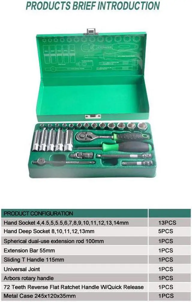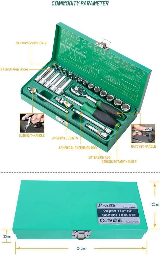 Pro'sKit SK-22401M 24Pcs 1/4" Spanner set Hand Tool Socket Wrench Set For Car And Machines Repair Tool Driver Socket Tool Set Compliant to DIN international standards. Noumenon made of chrome vanadium steel 50BV30 material. Used for a variety of automotive, machine repair occasion
