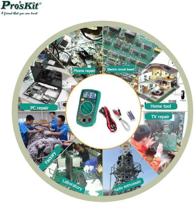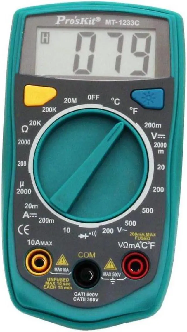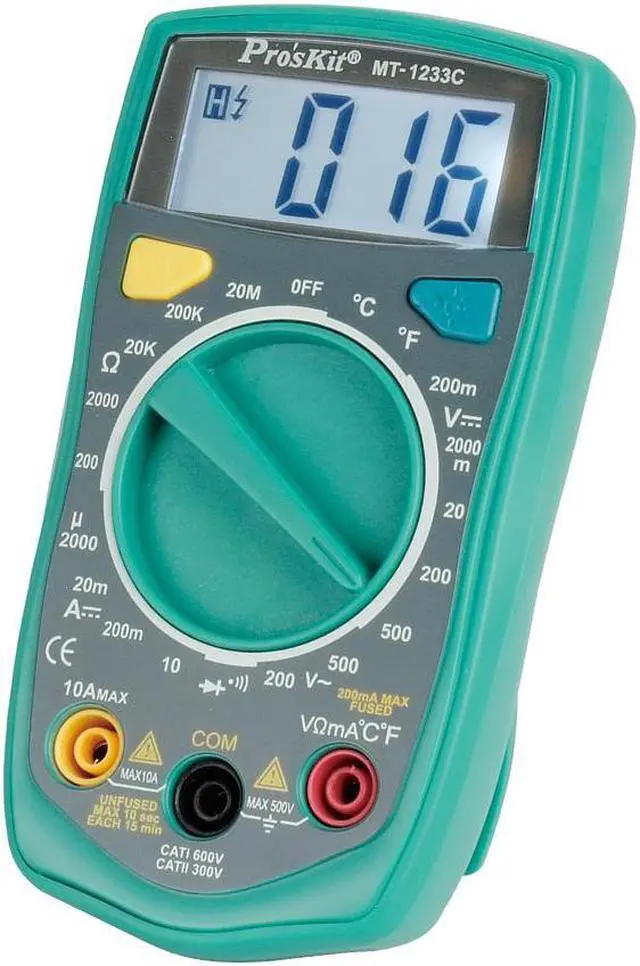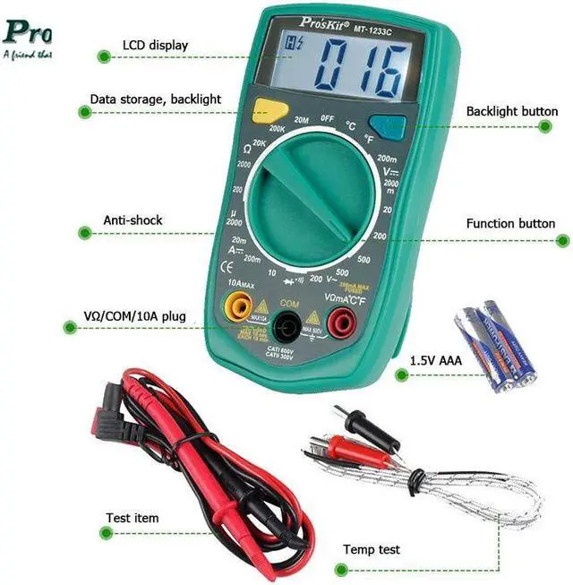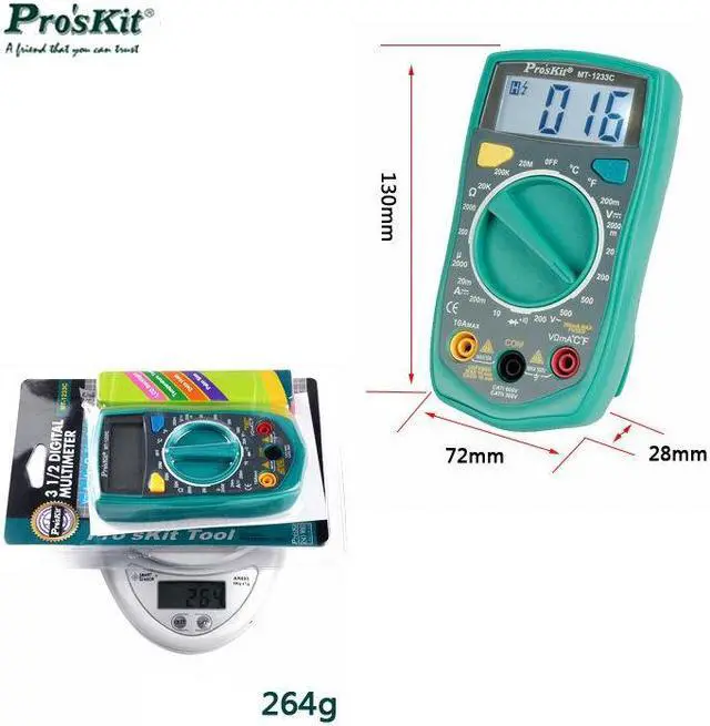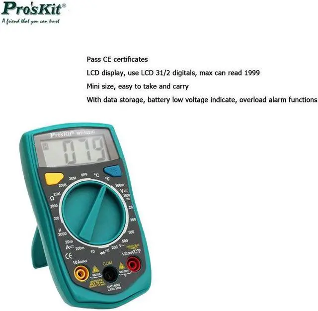 Pro'sKit MT-1233C-C 3 1/2 Digital Multimeter DC AC Voltage Current Resistance Tester Ammeter Multitester Temperature Tester Pass CE certificates LCD display, use LCD 31/2 digitals, max can read 1999 Mini size, easy to take and carry With data storage, battery low voltage indicate, overload alarm functions