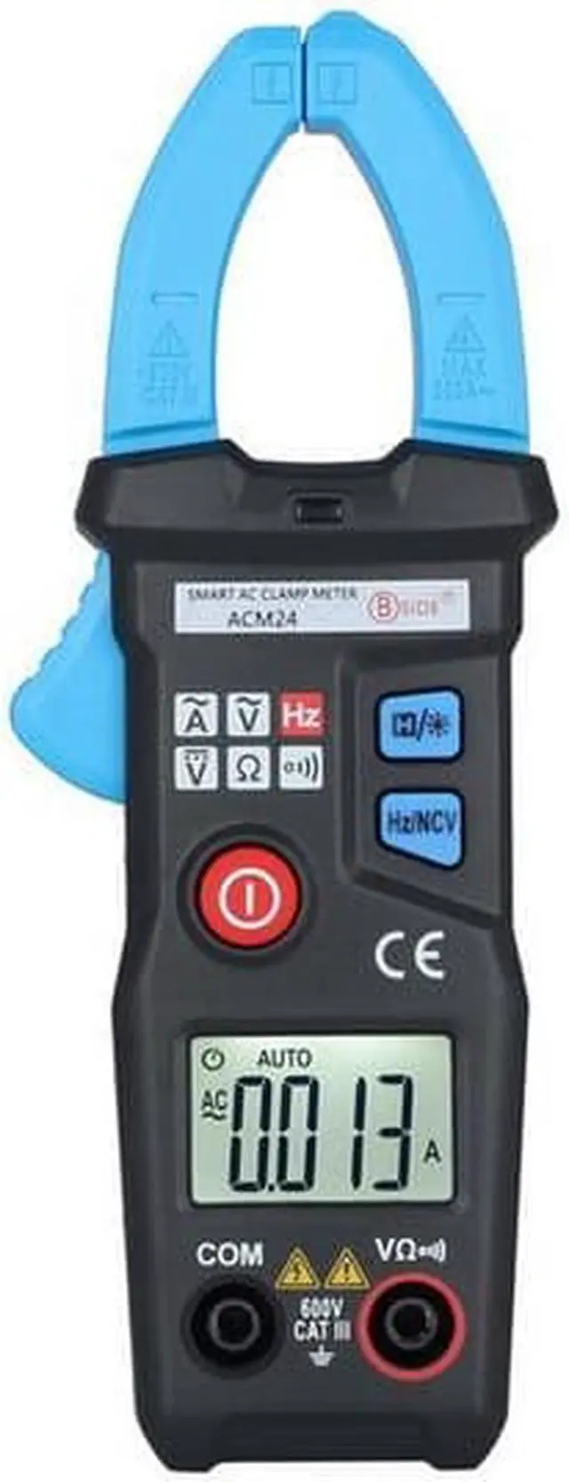 BSDIE ACM24 Smart Mini AC Digital Clamp Meter Electronic Tester Meter BSDIE Smart AC Digital Clamp Meter With NCVFeatures:The instrument shall be re-calibrated at an interval of one year under the conditions of 18 -28 and relative humidity of less than 75%.Specifications:The instrument is designed to automatically select measurement functions and measuring ranges.Full range overload protection.Allowable max voltage between terminal to be measured and ground:600V DC or 600V ACWorking weight: Max. 2000mDisplay unit: LCDMax display value: 6000 numbersPolarity indication: automatic indication.-indicates negative polarity.Over range indication:0L or -0LSampling rate: approximately 3 times per secondUnit display: to display functions and electric quantityAutomatic shut-down time:10 minutesPower supply: 1.5V AAA battery 2Battery under-voltage indication: LCD display symbolTemperature coefficient: less than0.1x accuracy/Working temperature:18 28Storage temperature:-10 50