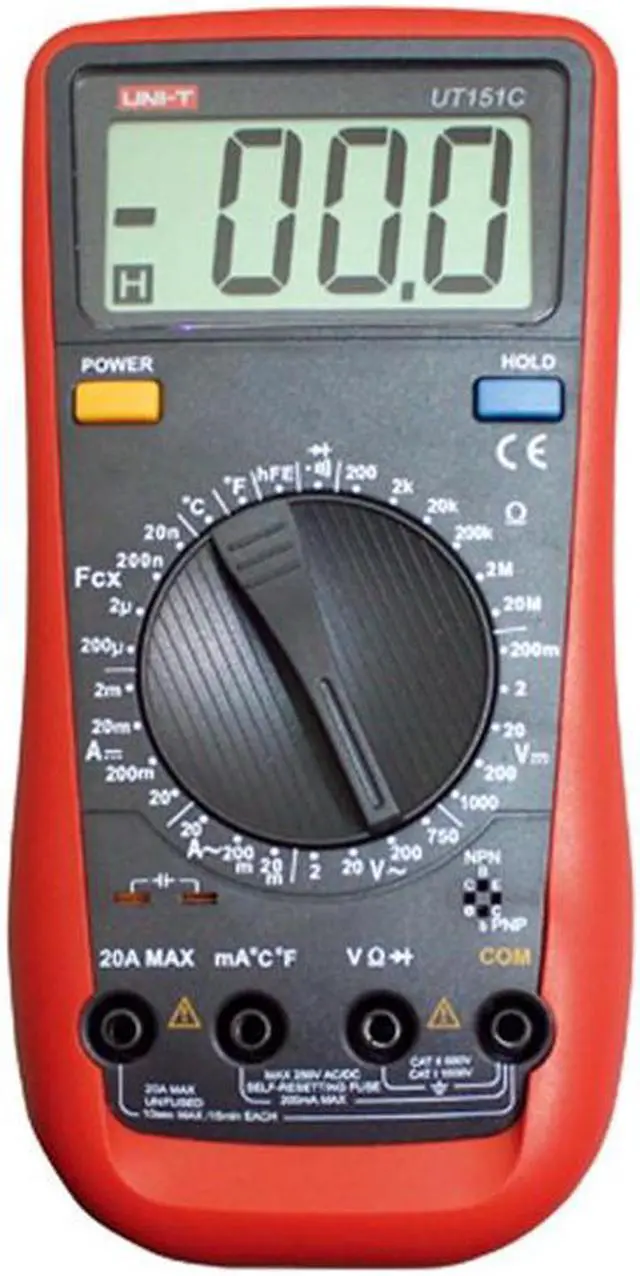 UT151C is a stable,high reliability handheld 3 1/2 digital multimeter, the circuit design is based on the double integral A/D conversion of large scale integrated circuit, full function overload protection and unique appearance design, which can test DC and AC voltage, current, resistance, capacitance, diode, battery ,open circuit and access . Moreover, the series mA slot using automatic recovery fuse, even if the wrong operation, users do not need to replace the fuse. It is suitable for measurement of smelting, communication, manufacturing, petroleum, national defense, electric power, chemical industry and other industries. Its an ideal tool for the maintenance and repair of the circuit , power equipment. Display Count 1999 Manual Range Diode Test Tansistor Auto Power Off Continuity Buzzer Low Battery Indication Data Hold Input Impedance for DCV 10M