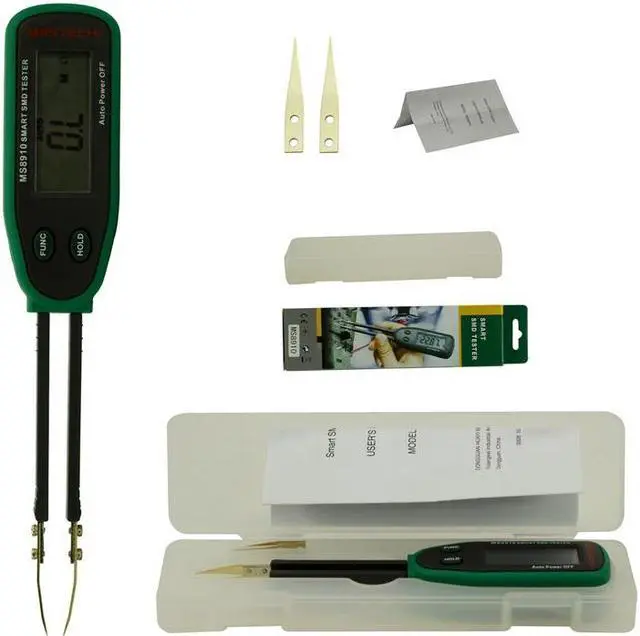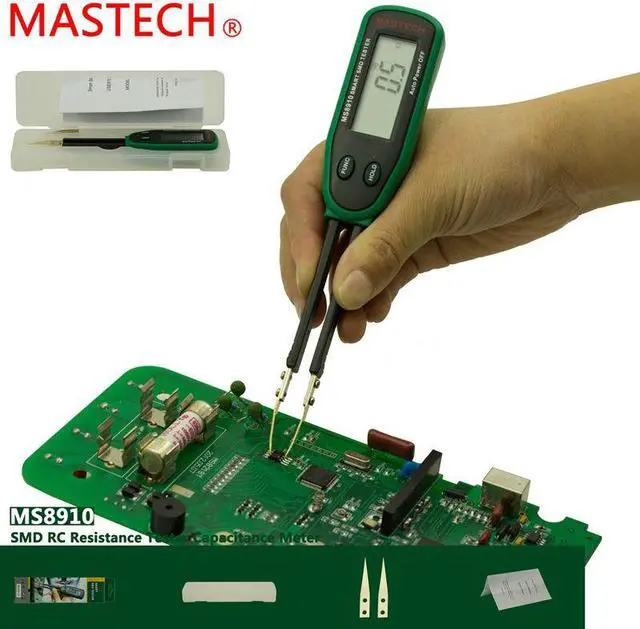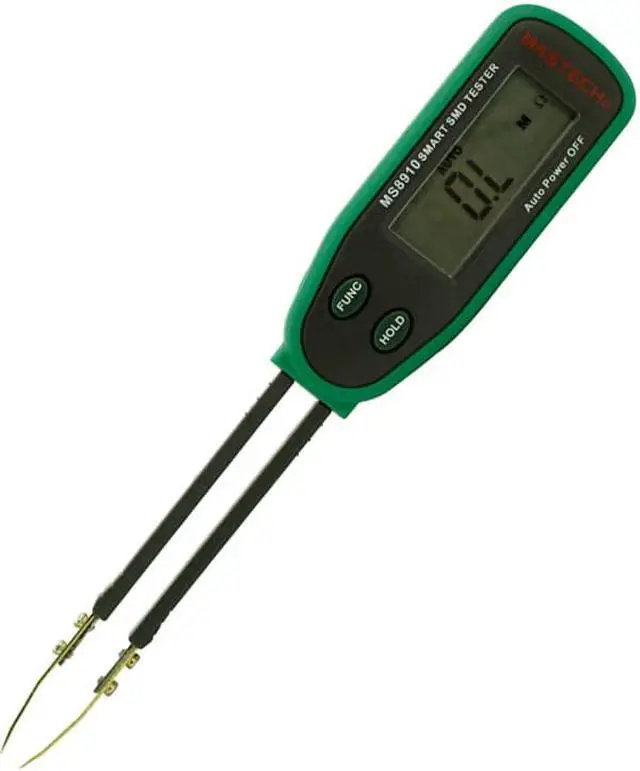 BrandMASTECHModelMS8910Quantity1ColorGreen + BlackMaterialABSLCD Display 1.6"S pecial FunctionsAutomatic detection measurement; auto power off; over load indicationApplicationused to measuring SMDMax. Display3000DC VoltageN/AAC VoltageN/ADC CurrentN/AAC CurrentN/AResistance 300.0 ohm ~ 30.000M ohm (1%rdg+ 2dgt) ohmCapacitance 3.000 nF~ 30.00 mF (3%rdg+ 3dgt)FrequencyN/APower Supply1 x 3V CR2032 (included) Packing List1 x Tester 2 x Spare test pins 1 x Carrying case 1 x English user manual