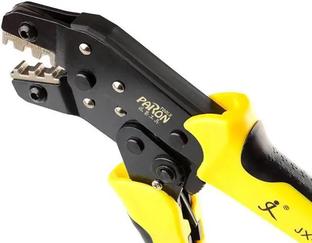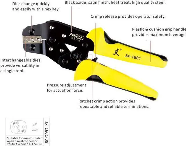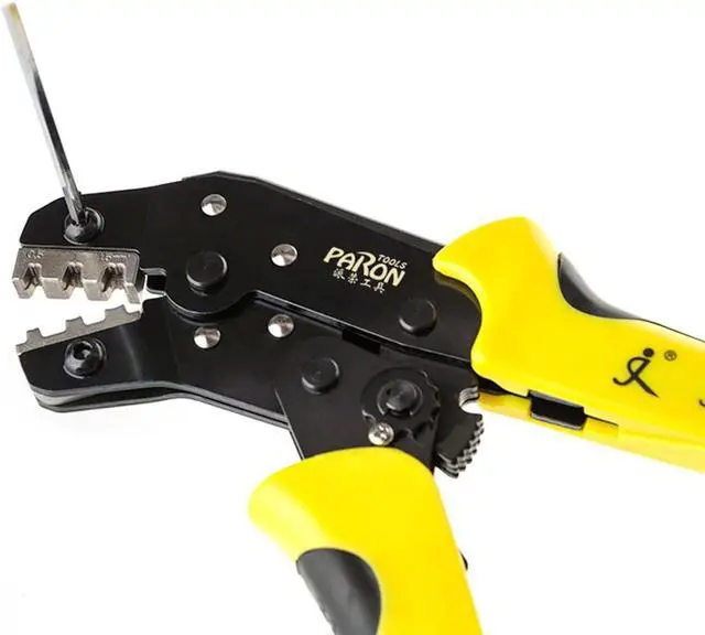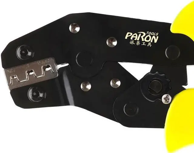 Features: The components of the ratchet crimping tools are made of special steel. Designed according to human factors engineering, it can save 50% energy when crimping. Accurate adjustment before ex works delivery. Due to great handle grasping position, light and compact structure and handle design ensure perfect crimping effect. Crimp non-insulated open barrel connector from 26 to 16 AWG( 0.14 - 1.5 mm). With adjustment screw, you can adjust the strength of crimping.