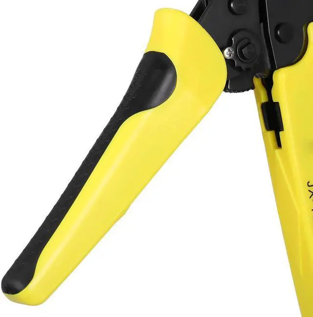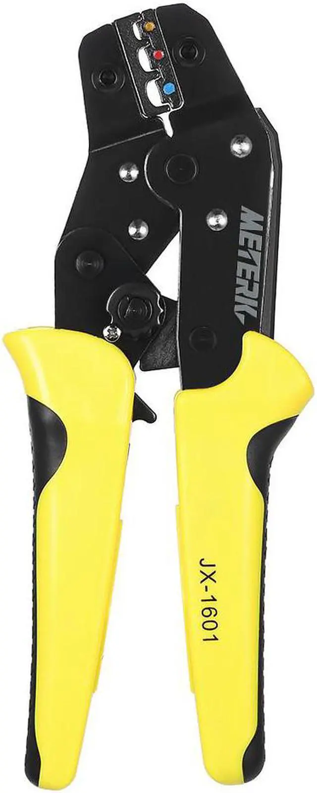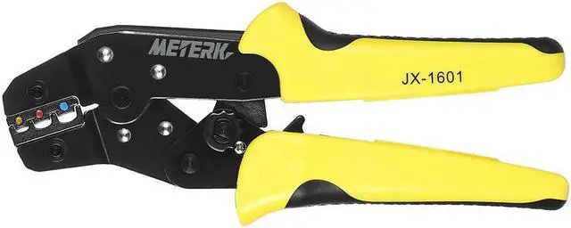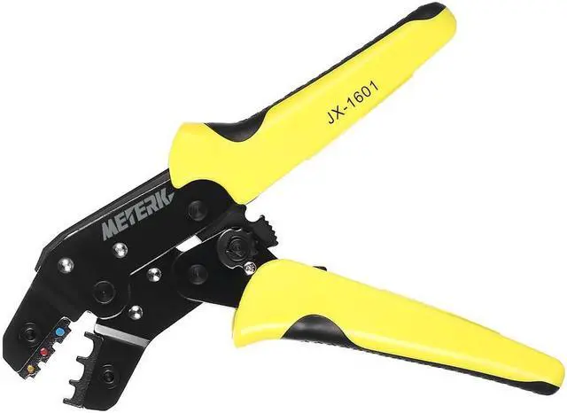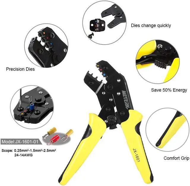 The wire crimper features convenience, efficiency and harmlessness to the cable cores. It is easy to use, just hold the handle and manipulate it once to successfully press tight the wire and terminal blocks.Features:Accurate adjustment before ex works delivery.Due to great handle grasping position, light and compact structure and handle design ensure perfect crimping effect.Crimp insulated terminals/color code nests from 24 to 14 AWG(0.25-2.5mm). (JX-1601-01)With adjustment screw, you can adjust the strength of crimping.The components of the ratchet crimping tools are made of special steel.Designed according to human factors engineering, it can save 50% energy when crimping. Specifications:Brand Name: MeterkMaterial: High-carbon Steel + AlloyColor: Yellow + BlackModel: JX-1601-01Suitable Terminals: Cord End Terminals / Insulated TerminalsCrimping Range: 24-14AWG(0.25-2.5mm) Item Size: Approx. 19 * 8 * 2cm / 7.48 * 3.15 * 0.79inItem Weight: Approx. 350g / 12.34ozPackage Size: Approx. 25.5 * 10.5 * 2.5cm / 10.04 * 4.13 * 0.98inPackage Weight: Approx. 386g / 13.62oz