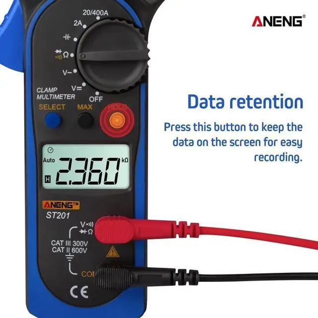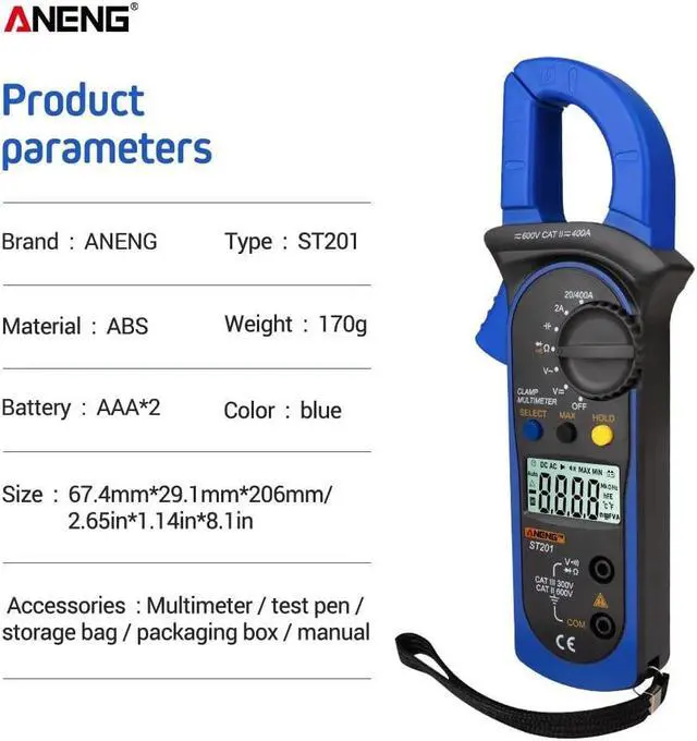 Specifications:Material: Plastic, Electronic PartsColor: Red / Blue (optional)Product Name: Clamp ammetersDC Voltage: 200mV-2V-20V-200V-600VAC Voltage: 200mV-2V-20V-200V-600VAC current: 2A-20A-400AMeasuring Capacitance Range: 40nF-400nf-4uF-40uF-400uFResistance(ohm: 200-2K-20K-200K-2M-20M)Buzzer Function: YesMax LCD display: YesData Hold Function: YesMax Display: 4000 CountsBattery Type: 2 x 1.5V (AAA Battery) (Not Included)Item Size: 206*67.4*29.1mm / 8.1*2.7*1.1"Item Weight: 170g / 6.0ozPackage Weight: 350g / 12.3ozPackage Size: 210*130*40mm / 8.3*5.1*1.6" Features:Digital Clamp Multimeter - This is a 3 3/4 digit automatic digital meter. It has stable performance,high precision,high reliability,clear reading and overload protection.Power By - The instrument is driven by an AAA 1.5V battery(not include) and uses a liquid crystal display with a boost power supply.Backlight Display - Maximum display,19999 counts. Optional backlit LCD with large digits for visibility even in dimly lit areas. Data hold function keeps measurements while record.Portable Size: The meter is easy to carry and very popular among users. Ideal for laboratories, factories, radio enthusiasts and families.Widespread Use - The instrument can be used to measure DC voltage and AC voltage,AC current 600A,resistance,capacitance diode,continuity test,it is an excellent tool and is an ideal tool for laboratories,factories,radio enthusiasts and families.