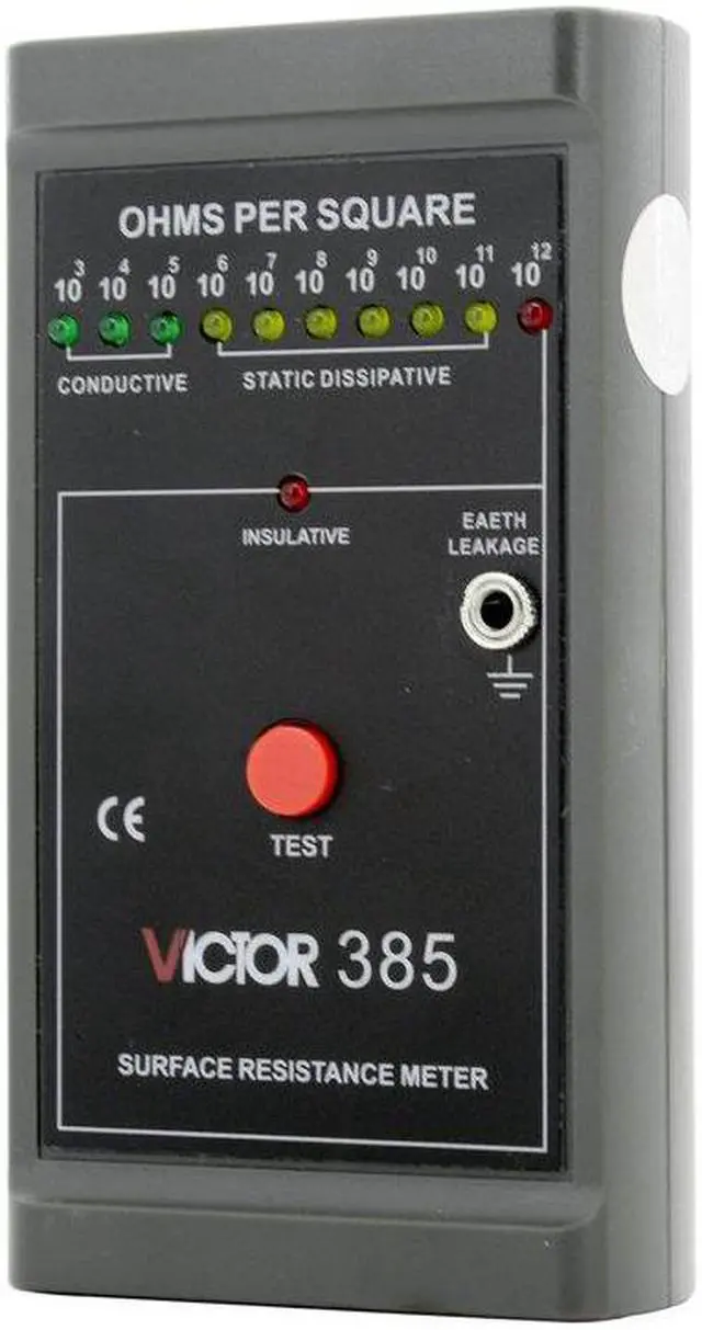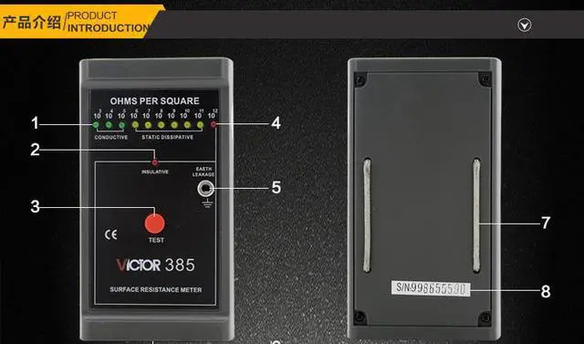 VICTOR VC385 VC 385 handheld Surface Resistance Tester Anti-static Testing Automatic Range 1000-1000G Ohm VC385 surface resistance tester, high-precision , suitable for measuring the surface resistance of the material, anti-static measurement, measure the insulation material. Surface resistance tester is widely used in microelectronics, pharmaceutical, aerospace, precision machinery, and other fields. Used to quantify the measurement of all conductive, surface resistivity or resistance antistatic systems and ESD material, simple to use, easy to carry. Large-screen liquid crystal display