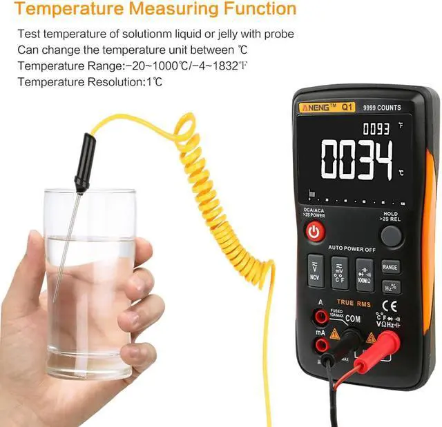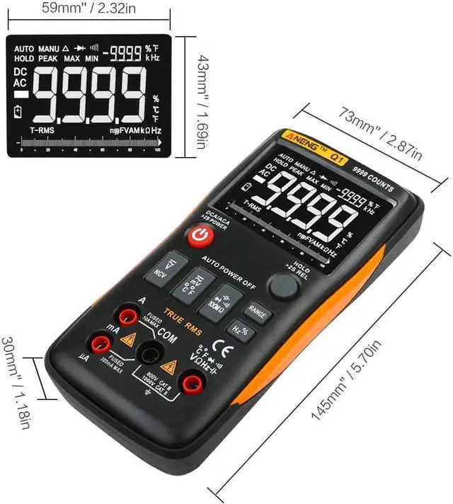 ANENG Q1 True-RMS Digital Multimeter Esr Meter Testers Automotive Electrical Dmm Transistor Peak Tester Meters Resistor - Orange Specifications:Brand Name: ANENGColor :Orange ColorModel Number: Q1Operating Temperature: 0 - 40 Operating Humidity: 75%RHStorage Condition: -20~60Storage Humidity: 80%RHDIY Supplies: ElectricalOperating Mode: Auto/Manual RangingMeasuring Inductance Range: noMeasuring Temperature Range: -20~1000 C/-4F-1832F Measuring Capacitance Range: 9.99nF/99.99nF/999.9nF/9.99uF/99.99uF/999.9uF/9.999MFMeasuring Voltage Range: 999.9mV/9.999V/99.99V/999.9VMeasuring Current Range:999.9uA/99.99uA/999.9mA/10AMeasuring Resistance Range: 99.99/999.9/9.999k/99.99k/999.9K/9.999M/99.99M OhmFrequency: 99.99Hz/999.9Hz/9.999KHz/99.99KHz/999.9KHz/5MHzDisplay Type: Digital DisplayDiode Test: YesContinuity: YesDuty Cycle: 1%-99%Sample Rate: 3 times per secondPower: 2 * 1.5V AA batteries(Not Included)