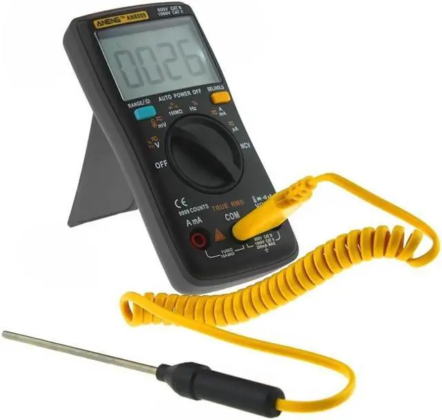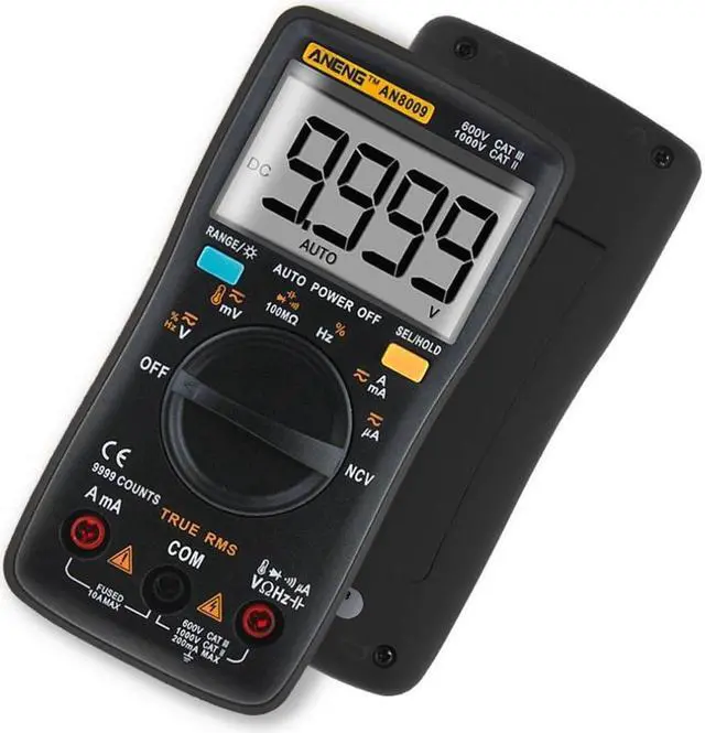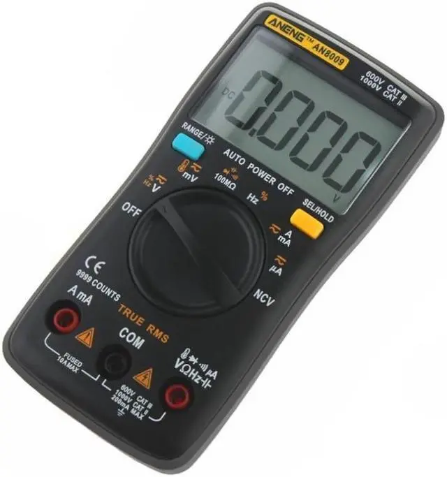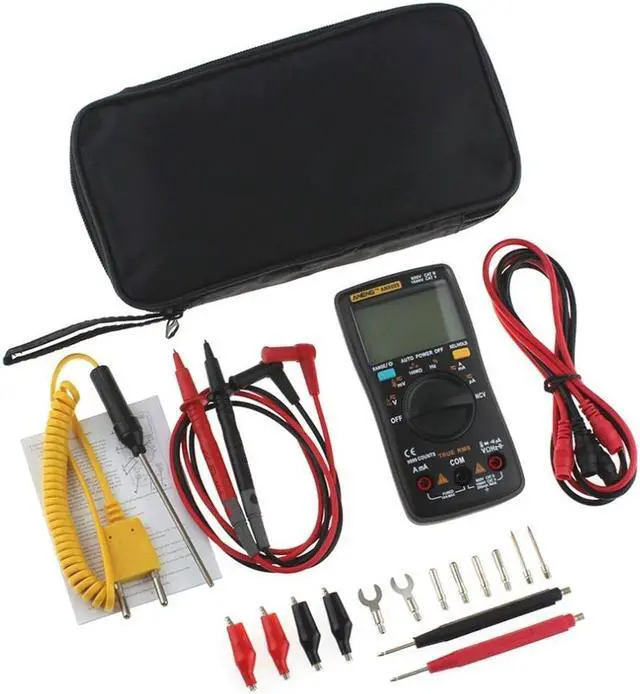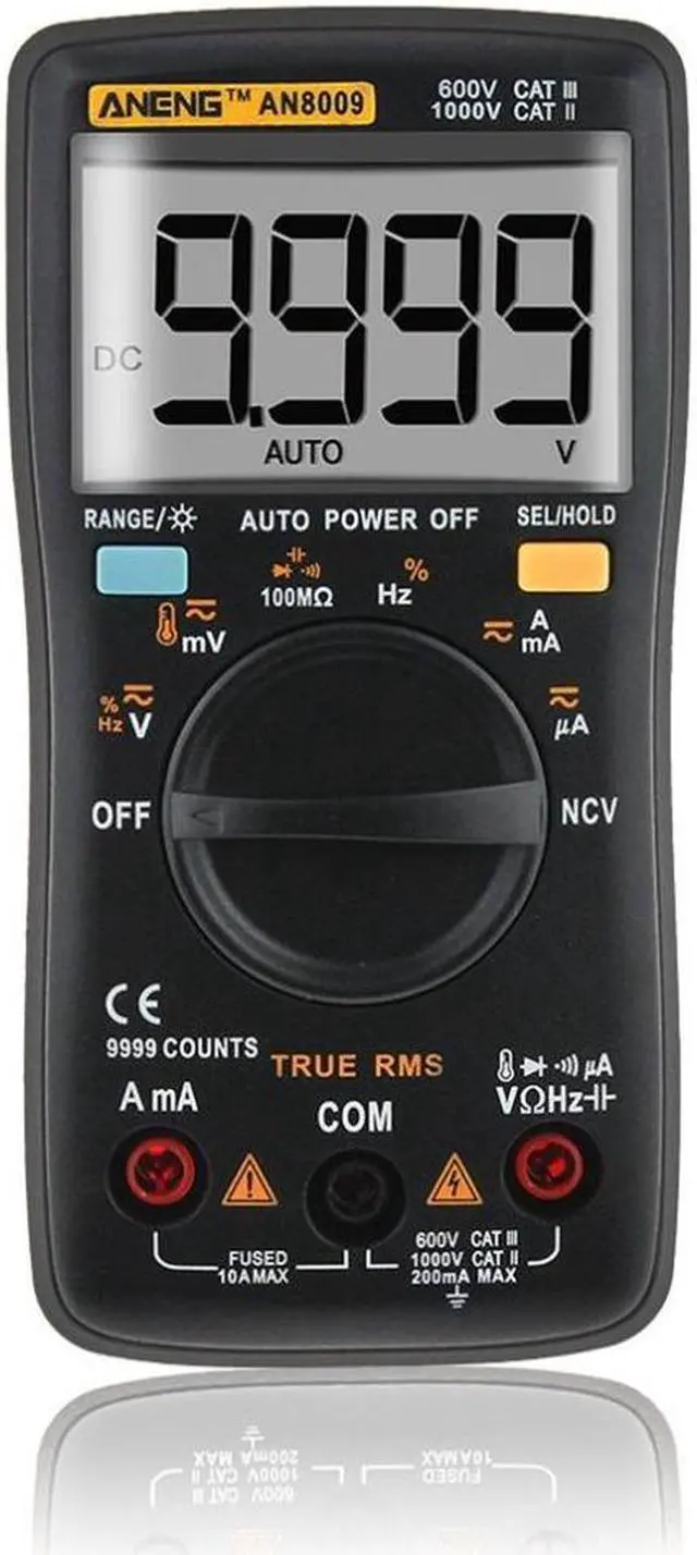 Specifications:Brand Name: ANENGModel Number: AN8009Operating Temperature: 0 - 40 Operating Humidity: 75%RHStorage Condition: -20~60Storage Humidity: 80%RHDIY Supplies: ElectricalOperating Mode: Auto/Manual RangingMeasuring Inductance Range: noMeasuring Temperature Range: -20~1000 C/-4F-1832F Measuring Capacitance Range: 9.99nF/99.99nF/999.9nF/9.99uF/99.99uF/999.9uF/9.999MFMeasuring Voltage Range: 999.9mV/9.999V/99.99V/999.9VMeasuring Current Range:60mA/600mA/10AMeasuring Resistance Range: 99.99/999.9/9.999k/99.99k/999.9K/999.9MFrequency: 99.99Hz/999.9Hz/9.999KHz/99.99KHz/999.9KHz/9.999MHzSquare Wave Output: 50Hz/100Hz/200Hz/300Hz/400Hz/500Hz/600Hz/700Hz/800Hz/ 900Hz/1000Hz/200DC/AC Voltage(mV): 9.999mV/99.99mVDC/AC Voltage(V): 999.9mV/9.999V/99.99V/750ACV(999.9DCV)DC/AC Current (mA&A): 999.9mA/9.999ADC/AC Current (uA): 99.99A/999.9ADisplay Type: Digital DisplayDiode Test: YesContinuity: YesDuty Cycle: 1%-99%Sample Rate: 3 times per secondPower: 2 * 1.5V AAA batteries(Not Included) Digital multimeter model can measure AC / DC voltage, DC Current, Resistance, Continuity, Diodes, Transistor hFE and so on. Portable, and easy to use. It can service well in fielf of maintenance of auto, electrical engineering and teachig lab, ect.Features:With large overview backlit LCD display, date can be shown clearly.Backlight can make display easy to read in the dark condition.Small size, portable with a pouch, you can take it to anywhere you need it.Compact ergonomic design, looks very nice.One-handed operation perfect choice for carry-on measuring.Allows for various electrical tests including Resistance, DC/AC Voltage and Current tests with a simple switch.Easy to work, auto ranging accurately measures with self-calibration chip to make sure the accuracy and stability.