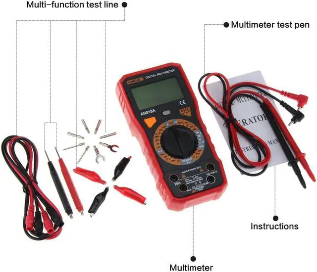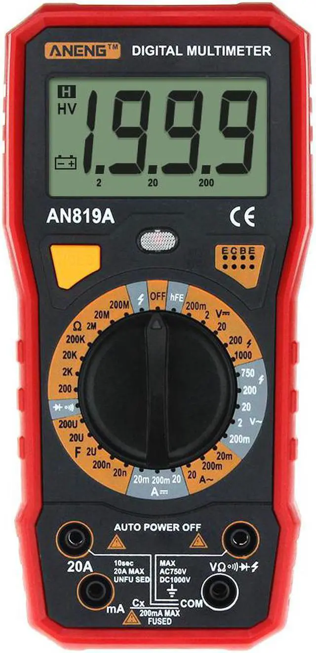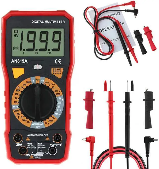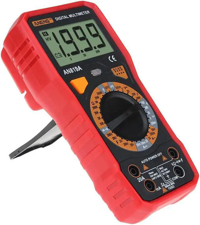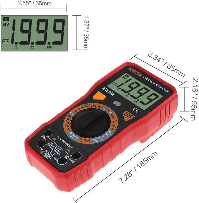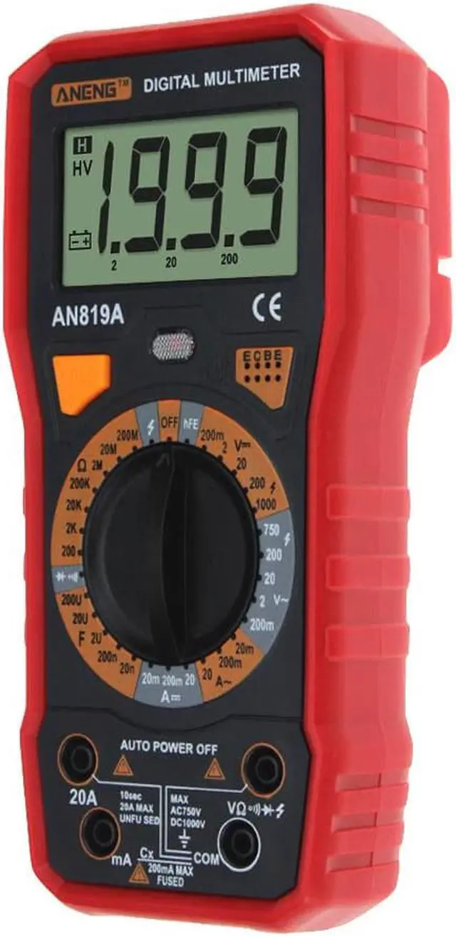 ANENG AN819A Digital Multimeter Esr Meter True Rms Digital Multimeter Tester Voltmeter Battery Tester Multimetro Richmet - Red SpecificationDC Voltage: 200m-2-20-200-1000V AC Voltage: 200m-2-20-200-750V AC Current: 2mA / 20mA / 200mA / 20ADC current: 2mA / 20mA / 200mA / 20ACapacitance: 2nF/ 20nF/ 200nF/ 2uF/ 20uF/ 200uFResistance: 200/ 2K/ 20K/ 200K/ 2M/ 20M/ 200M/ 2000MFinding FireWire: YesOn-off detection: YesTriode measurement: YesBuzzer: YesDimensions:185 x 85 x 45mmDisplay Type: Digital Display Battery: 6F22 9V (Not included)Operating Temperature: 0 - 40
