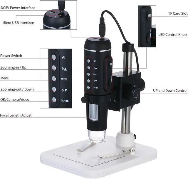 Specifications:Material: ABSInput: AC100~240V, 50/60HzOutput: 5V, 2AMagnification: 10~1000XPhoto Capture Resolution: 1920*1080Image Format: JPG/BMPVideo Format: AVILight Source: 8 LED lights (adjustable by control wheel)Manual Focus Range: 10~40mmFrame Rate (Max.): 30FPSFunction Buttons: Switch key, amplify button, menu key, lessen button, photo/video button.Socket: DC5V power socket, Mini HD socket, Micro USB socket, TF card slot.Adjustment Focal Length: focusing knobTF Card Slot: Max. support 32GLens Optical Size: 1/3in (6.0mm)Power Supply: DC5V, 1A (external power supply), or US plug (100V-240V)Item Size: 160 * 120 * 213mm / 6.30 * 4.72 * 8.39inItem Weight: 415g / 14.65ozPackage Weight: 554g / 19.54ozPackage Size: 18.5 * 17.2 * 7.8cm / 7.28 * 6.77 * 3.07in This is a high-resolution electron microscope that can be widely used in industrial inspection, telecommunications module inspection, scientific research, textile inspection, jewelry inspection, printing inspection, etc. This microscope supports to connect to a computer. At the same time, the product supports photo, video and file storage.Features:Supports mouse operation, which is convenient for operating the functions including of taking photos, video recording, image zooming, image zooming-out, and playback.This digital microscope is useful, funny and portable, which is great for children, students, collectors, testers, and anyone interested in exploring the microscopic world.Built-in 8 LED lights and adjustable illumination, 5MP camera, adjustable magnification ratio, 0X to 1000X offers you a wonderful experience of recording a clear microworld.360 adjustable stand is great for hands-free operation and the distance between microscope and object is adjustable.Microscope with USB interface to connect to computer, easy to operate.Suitable for industrial inspection, computer parts inspection, scientific teaching tool, insect/plant/skin/scalp examination, textile inspection, jewellery inspection, collections coin inspection, printing inspection and so on.