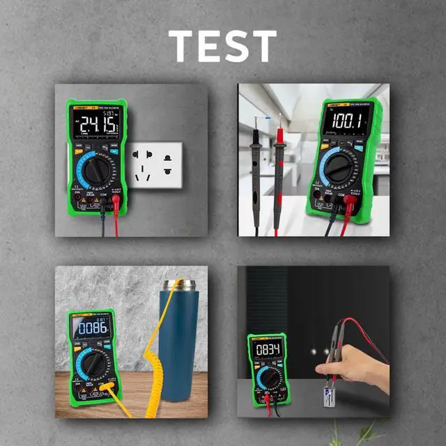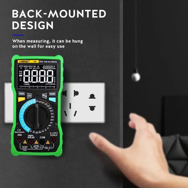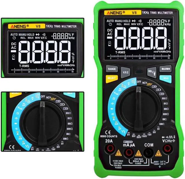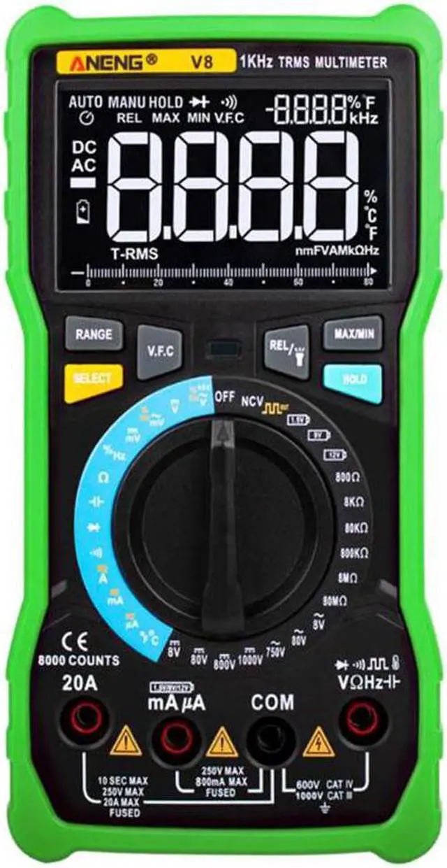 Frequency: 9.999Hz/99.99Hz/999.9Hz/9.999kHz/99.99kHz/999.9kHz/9.999MHz Duty cycle:1%~99% Square wave output:50Hz~5000Hz Battery test:1.5V/9V/12V Ranging:Auto/manual Material:ABS/PVC Update Rate:3 times/second Ture RMS: Data Hold: Backlight/Flashlight: Low Battery Alert: Auto Power Off: Features1.With 8000 counts LCD backlight display,wide measurement range and can read data in dark. 2.Temperature range:-20~1000(-4~1832). 3.NCV test:Non-contact voltage detection function make it detect voltage without touching any wires to avoid electric shock. 4.Advantages:True RMS,auto power off,data hold,max/min value,etc. 5.Multifunction:Can accurately measure AC/DC voltage,AC/DC current, resistance,temperature,capacitance,frequency,diode test,continuity,battery test. SpecificationsBrand Name: ANENG Model:V8 Display:8000 counts Temperature range:-20~1000(-4~1832) DC Voltage(V):8.000V/80.00V/800.0V/1000V DC Voltage(mV):800mV AC Voltage(V):8.000V/80.00V/750V AC Voltage (mV):800mV DC Current(A):8.000A/20.00A DC Current(mA):8.000mA/80.00mA/800.0mA DC Current(uA):800uA/8000uA AC Current(A):8.000A/20.00A AC Current (mA):8.000mA/80.00mA/800.0mA AC Current(uA):800uA/8000uA Resistance:800.0/8.000k/80.00k/800.0k/8.000M/80.00MCapacitance: 9.999nF/99.99nF/999.9nF/9.999F/99.99F/999.9F/9.999mF/99.99mF