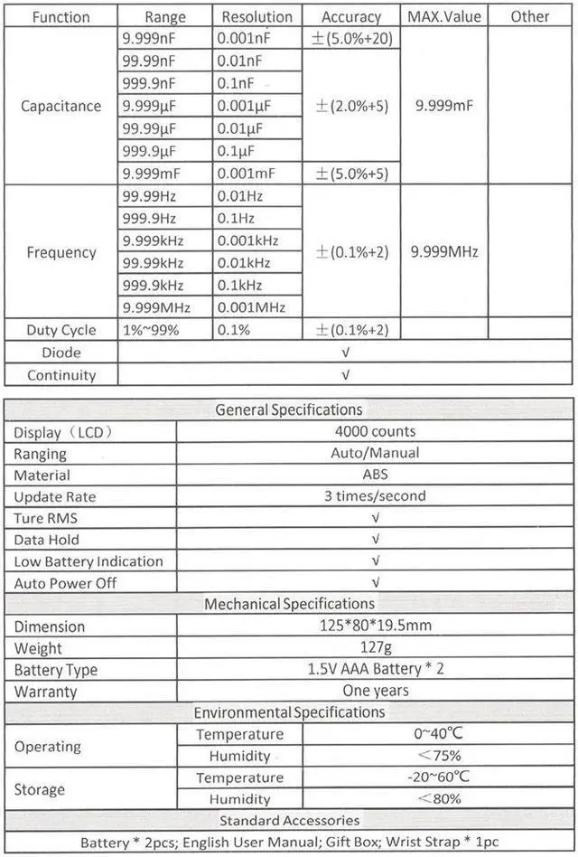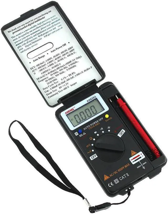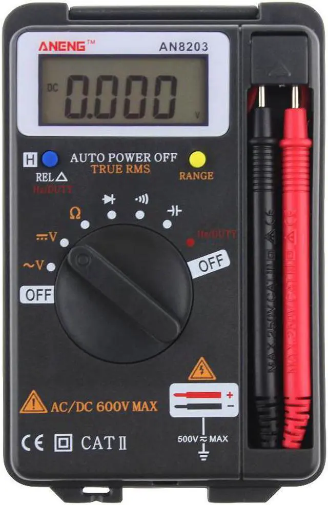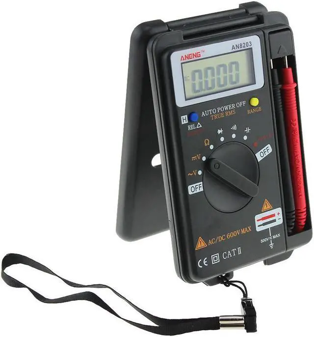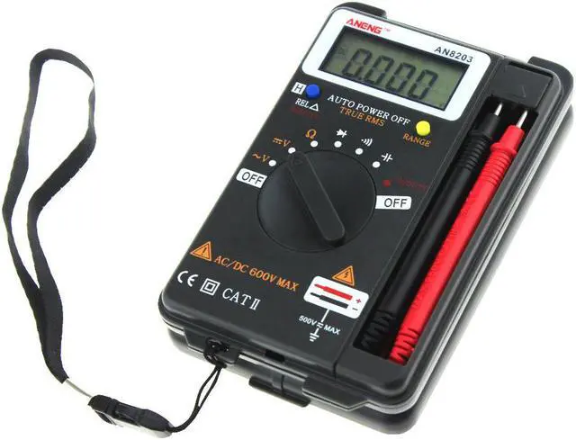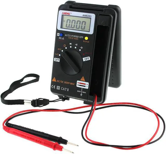 ANENG AN8203 Mini Digital Multimeter 4000counts True Rms Digital Multimeter Tester Voltmeter Battery Tester Multimetro Tester Features:3999 Max. DisplayAuto/Manual rangeSymbol display, more convenient to useMetallic screen board with stronger antimagnetic and anti-interferential function.Full protection, anti-high voltage circuit designSpecifications:Display: 3999 counts (LCD)Ture RMS: YesData Hold: YesLow Battery Indication: YesAuto Power Off: YesUpdate Rate: 3 times/sAC Voltage: 400mV/4/40(0.5%+4) 400/600V (0.8%+4)DC Voltage: 400mV/4/40/400V(1.2%+4) 600V (1.5%+4)Resistance: 400/4K/40K/400K /4M(0.8%+4) 40M(2.0%+4)Frequency: 99.99Hz/999.9Hz/9.999kHz/99.99kHz/999.9kHz/9.999MHz (0.1%+2)Duty cycle: 1% to 99% (0.1%+2)Capacitance: 9.999nF/99.99nF/999.9NF/9.999uF/99.99uF/999.9uF(2.0%+4) 9.999mF (5%+5)Powered by 2 x 1.5V batteries (NOT included)note: AC/DC Current can not testSize: Approx. 120mm x 80mm x 20mm / 4.9x3.15x0.79inQuantity: 1 SetNote: Due to the difference between different monitors, the picture may not reflect the actual color of the item. Thank you!Please allow 1-3mm error due to manual measurement. pls make sure you do not mind before you bid