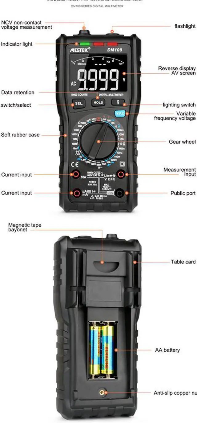Features: 10000 counts, analog bars and digital dual display, intelligent dual core measurement data processing. High-speed measurement of voltage, resistance, capacitance. V. F. C variable frequency voltage measurement function, NCV non-contact measurement voltage, AC voltage and current frequency test, automatic identification diode & on/off. The fuse is disconnected from the automatic alarm function, multimeter pen wrong insert anti-burn alarm function. 1KHz real effective measurement, measuring 1.5V /9V battery voltage with load. Contact single-table pen recognizes live line, analog LCR professional capacitance test. Automatically detects ambient temperature and humidity values. The shell is made of ABS fireproof material and has a hard texture. PVC leather case, anti-fall and wear-resistant.