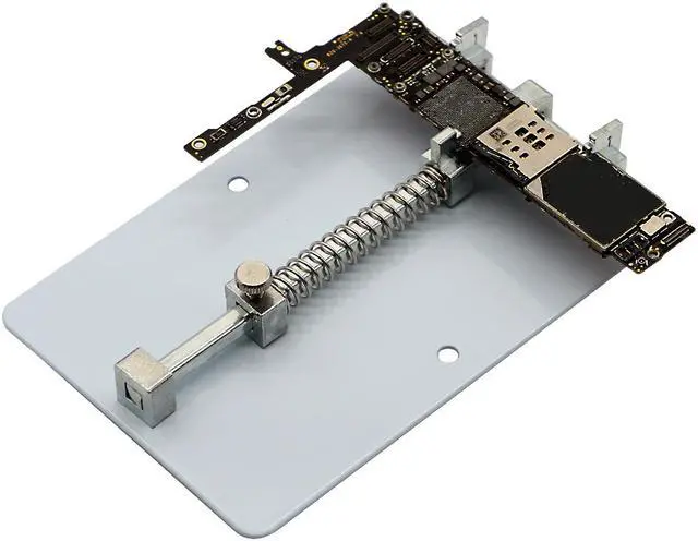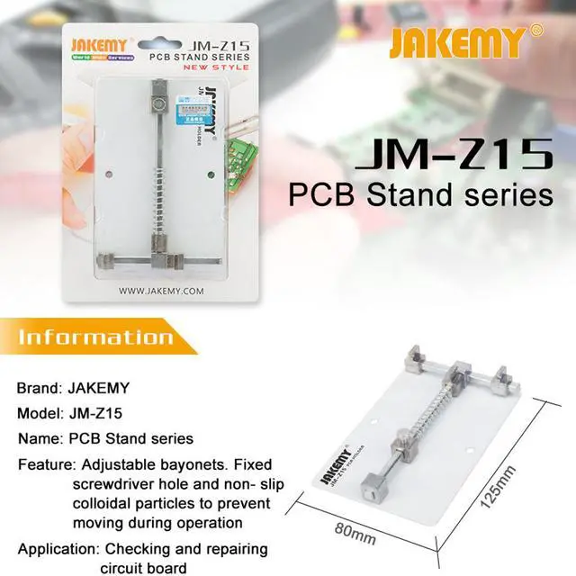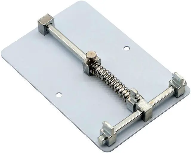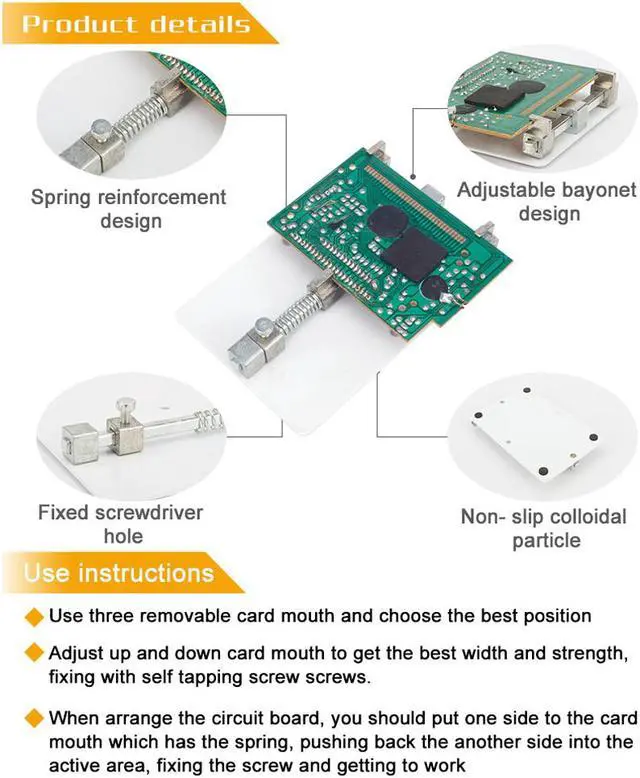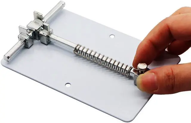 Features: Adjustable card mouth, easy to adjust to the best width and intensity, leaving plastic antiskid granules screw fixing hole and bottom, to prevent the occurrence of displacement clamp in operation. 1. When you install your circuit board to the holder, it is better to install one side and then another side. 2. You can place the PCB holder in your table when you are removing the big IC. 3. Three pieces bayonet can be move, you can choose the position to holder your circuit board.