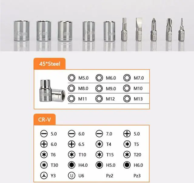 JAKEMY JM-6095 Portable Chrome Vanadium Screwdriver Tool Box Set DIY Hand Tool for Home Electronics Repair 9PCS inter Hexagon Sockets (white color) M 5.0, M 6.0, M 7.0, M 8.0, M 9.0, M10, M11, M12, M1320PCS 6.3 mm Chromium plated screwdriver bits (black color)