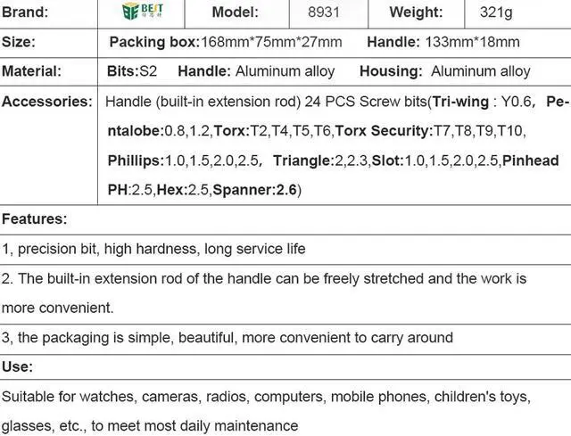 screwdriver bits: 24pcs Aluminum shellAluminum handle