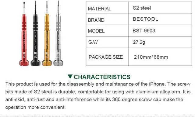 Phone Repair Tools Feature: Comfortable Handle 1 Aviation aluminum handle, good handle feeling, non-slip, anti-ompact, anti-rust, effectively improve work efficiency2 High-precision screw bit, fully matches with screw, and can drill broken screws easily. 3 S2 stainless steel