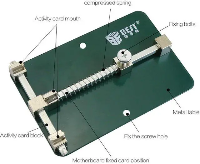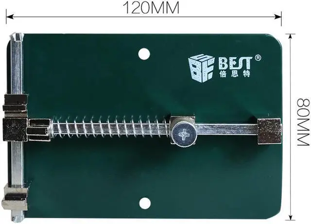 Gross weight: 233 g Universal holder for mobile phone repair. Adjustable clips and fastening screw. Mounted circuit board, the first side of the circuit board into the card with a spring mouth, pushed back and then another circuit board into the activities card block fixing screws can work.