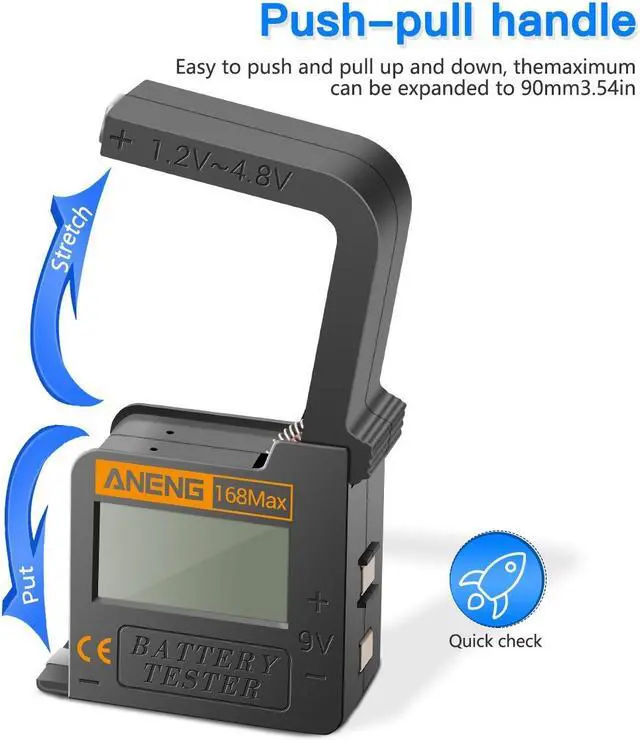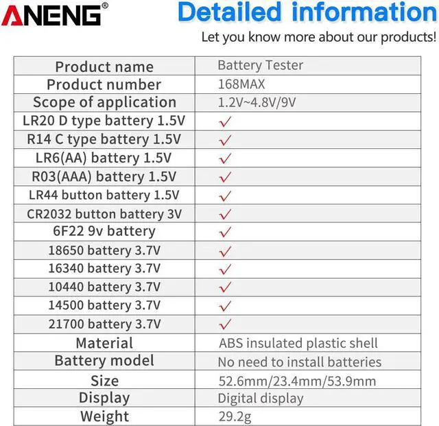 - Wide Application: 1.2 ~ 4.8V batteries type of AA, AAA, D, C, 6F22, 18650, CR2032, LR44, 9V battery, etc. The battery tester can be used to test the following types of battery: -