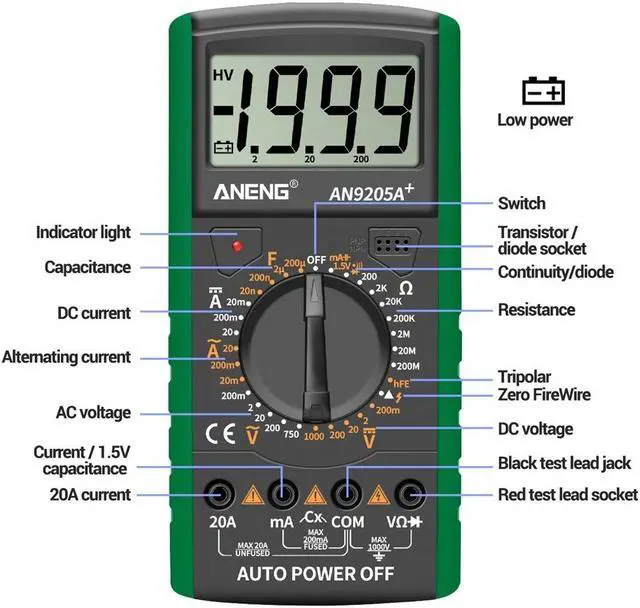 - Wide Application: DC voltage measurement, AC voltage measurement, DC current measurement, AC current measurement, capacitance measurement, resistance measurement, continuity detection, triode measurement, zero/fire wire testing and diode measurement.