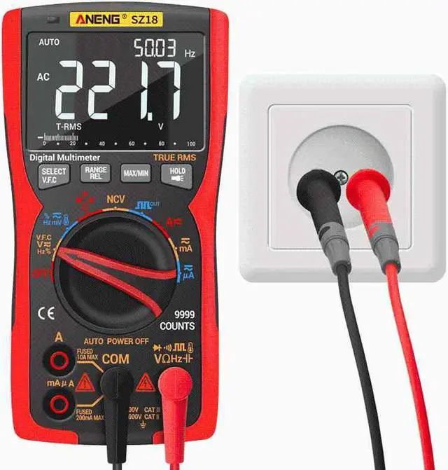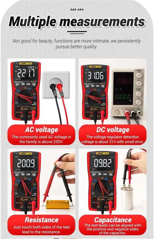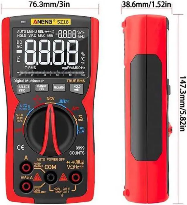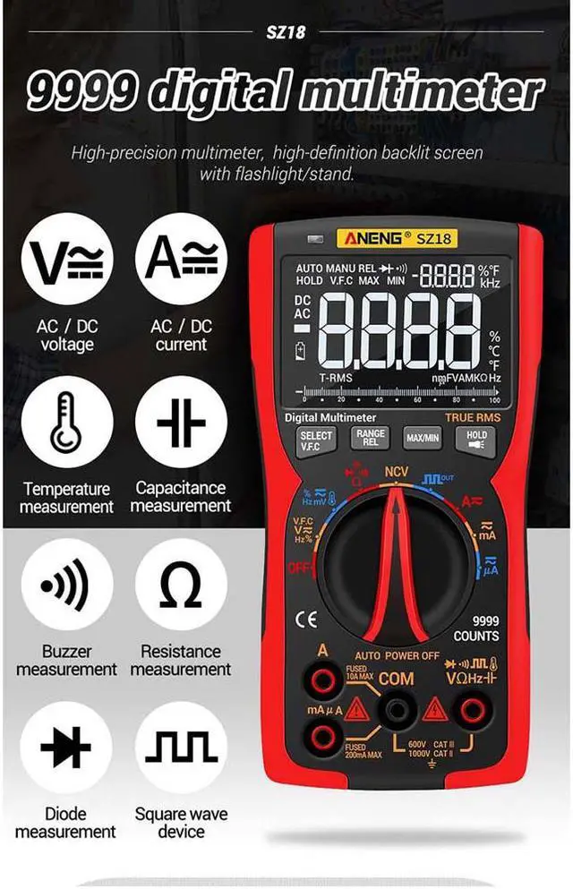Specification: BrandANENGModelSZ18Liquid crystal Display (LCD) 9999RangeAutomatic / manualMaterialABS + TPESampling rate3 times / secTrue RMSYesData retentionYesScreen backlightYesLow battery warningYesAutomatic shut-downYesBattery Type3 * 1.5 v AA battery (not included) CharacteristicsRangeAccuracyAC frequency responseDC Current 9.999A / 999.9 mA( 1.0 % + 3)-DC Current 99.99 mA/ 9.999 mA/ 99.99 A/ 999.9A ( 0.8 % + 3)-AC Current 9.999A / 999.9 mA( 1.2 % + 3)40hz~1khzAC Current 99.99 mA/ 9.999 mA/ 99.99 A/ 999.9A ( 1.0 % + 3)40hz~1khzDC Voltage999. 9mv/ 9.999 v/ 99.99 v/ 999.9 v/9. 999mv/99. 99mv/ 999.9 mv( 0.5 % + 3)-AC Voltage999. 9mv/ 9.999 v/ 99.99 v/ 750.0 v/9. 999mv/99. 99mv/ 999.9 mv( 1.0 % + 3)40hz~1khzResistance 99.99 ( 1.0 % + 3)-Resistance 999.9 / 9.999 k / 99.99 k / 999.9 k( 0.5 % + 3)-Resistance 9.999M ( 1.5 % + 3)-Resistance 99.99M ( 3.0 % + 5)-Capacitance 9.999 nF( 5.0 % + 20)-Capacitance99. 99nf/999. 9nf/ 9.999 f/ 99.99 f/ 999.9 f( 2.0 % + 5)-Capacitance 9.999 mF( 5.0 % + 5)-Frequency 99.99 hz/ 999.9 hz/ 9.999 khz/ 99.99 khz/ 999.9 khz/ 5.000 mhz( 0.1 % + 2)-Temperature(-20 ~ 1000) / (-4 ~ 1832)( 2.5 % + 5)-Duty cycle1% ~ 99%DiodoYesOn /offYesNCVYesWorking environmentTemperature0 ~ 40 Humidity<75% ANENG SZ18 is an automatic range digital multimeter with 9999 words with a true effective value.