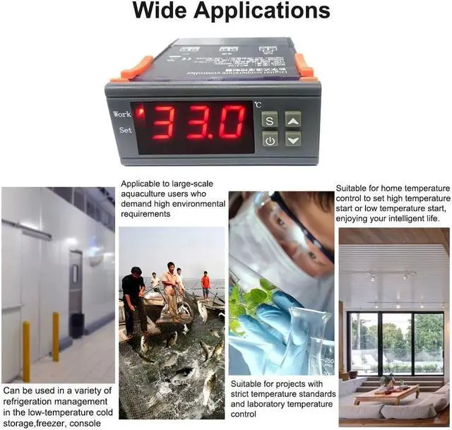Features: High accuracy and wide measuring range. Stable performance, supports long time use. With large and clear display for better readability. Support cooling/heating control and temperature calibration function. Applied to plant oil stove, hatching device, refrigerator and so on.