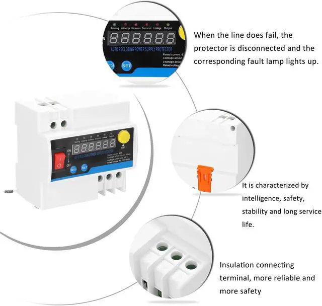 Undervoltage/Loss of Voltage-Protection: When the powersupply voltage is lower than 160 V5 V, the protector is disconnected, and after the voltage rises to normal (>170 V), the protector automatically switches on and energizes; When the powersupply network loses voltage and power, the protector disconnects the input and output, and the protector automatically switches on and turns on after the powersupply of the power network resumes normally for 2 seconds.