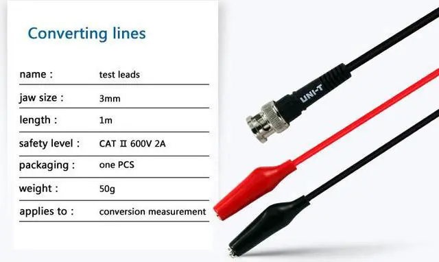 • Length: 1000mm Clip Opening:3mmSafety level: CAT II 600V 2AApplication:BNC connector for instrument inputsAmount: 1PCS