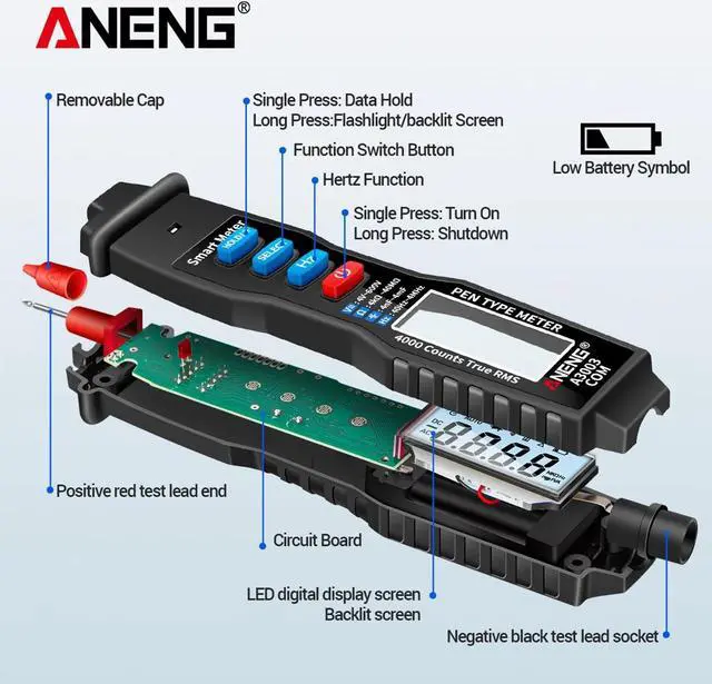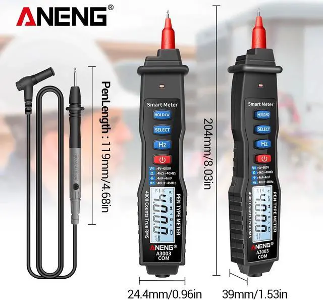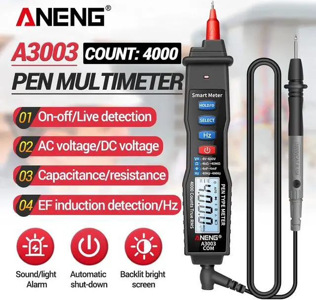 Features: Multifunction Pen Multimeter -- This pen-type digital multimeter can perform 4V-600V AC/DC voltage measurement, resistance from 4k - 40M, capacitance, frequency test and On-off buzzer detection, Zero fire detection, etc. Convenient Use -- Since 4000 counts large backlight LCD scree and flashlight function, the value can be clearly read even in dark places. Data hold function, you can save data with one click, convenient for data reading. Non-Contact Measurement -- Digital multimeter supports NCV non-contact voltage detection, and can distinguish the null line and the fire wire to avoid the risk of electric shock. Safe and reliable. Auto Power Off & Audible Alarm -- The pen multimeter has an automatic shutdown function, which will automatically shut down if there is no operation for mins, lowe power consumption. Audible + light alarm make measurement more easy. Easy Carry -- Compact pen type design for convenient single hand use, easy to carry and operate. It is very suitable for home, school, laboratory, factory and other applications.