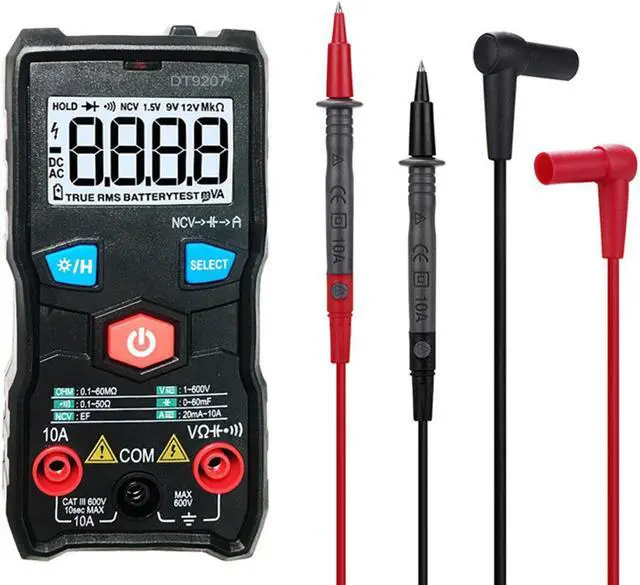 materialsize: 120 x 60 x 30mm Full Smart Digital Multimeter, Automatic identification of measurement dataHigh-brightness lighting flashlight Users in the night and low-light environment can be used normallyDC voltage measurement, 6F22 9V battery, Automatic recognition, Resistance measurementElectric pen function (NCV) measurement Press and hold the NCV button and place it near the object to be measured to measure whether the object is live (only AC can be measured)