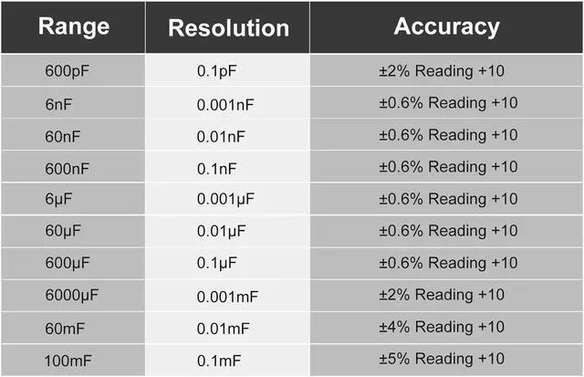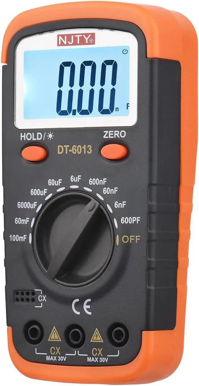 Features: This digital capacitance meter is built in with high accuracy chip and high speed processor, features 6000 counts and 10 measuring ranges from 600pF to 100mF. Made of selected ABS material, the housing is wear resistant and with great durability. Compact size, easy to hold and operate. Large LCD screen with backlight display, data hold function and zero function, making it easy and clear to read even in dark environments. The kit also contains 2 crocodile clips and 2 fuses ( 0.2A ). Powered by 2 AA batteries (not included), easy to install or replace batteries. Foldable bracket makes it take up less space and easy to be placed on the desktop; and also makes it convenient to carry outside.