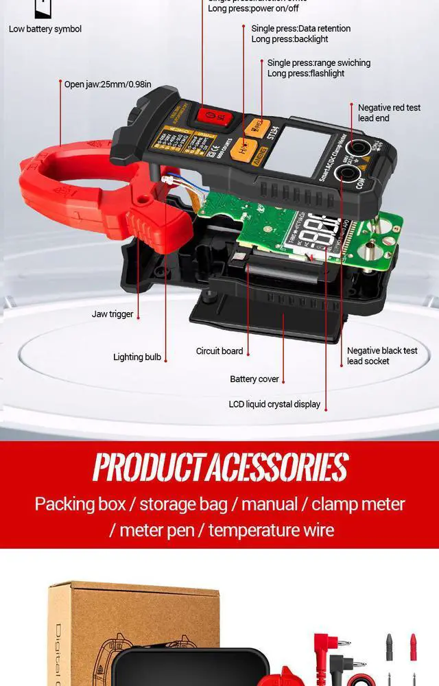 Function ST193 ST194 DC Current DCA AC Current ACA DC Voltage DCV AC Voltage ACV Resistance Diode/Capacitor/On-off beef Frequency Touch Key Data Retention NCV Zero Line/Fire Line Test Backlight manual/Auto off True RMS Measurement Temperature (F) Flashlight lighting Function Range Accuracy AC Current ACA 6~600A +-(3%+20) DC Current DCA 0~600A +-(3%+8) DC Voltage DCV 0~500V +-( 0.5 %+5) AC Voltage ACV 0~450V +-( 1.2 %+5) Capacitor 0~ 99.99 mF +-(2%+20) Resistance 0~10M +-( 0.8 %+3) Temperature (F) -20~1000 +-( 1.9 %+5d) -4F~1832F +-( 1.9 %+6d) Frequency 0~ 9.999MH +-( 0.1 %+2) Max Display (LCD) Battery Type Material 6000 Counts AAA( 1.5V )*2 ABS The strument is an professional measuring instrument with liquid crystal display and a back light source.