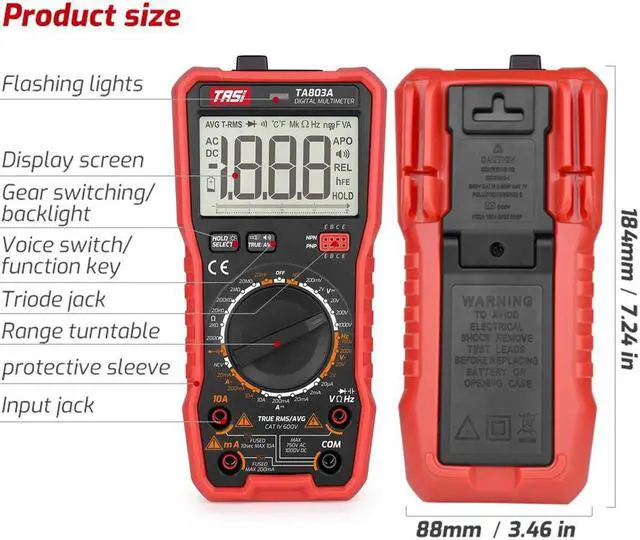More Features of TA803B: automatic range, diode test, MAX/MIN value measurement, temperature measurement, duty cycle/relative value, 5999 counts maximum display. Backlit Bright Screen for
