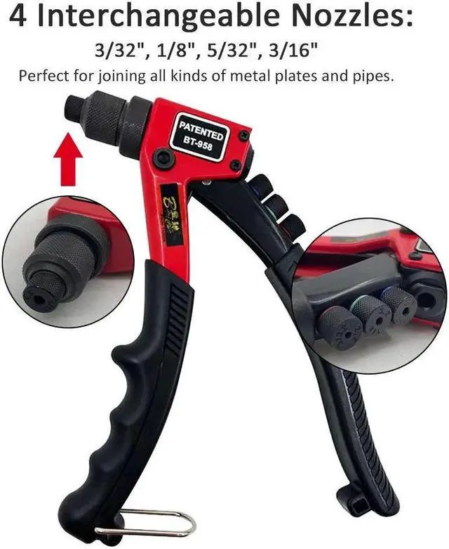 4 Interchangeable Heads: 4 interchangeable heads 3/32"( 2.4 mm), 1/8" ( 3.2 mm), 5/32" (4mm), and 3/16"( 4.8 mm) are stored on the handle, which provides you with everything you need to start riveting.