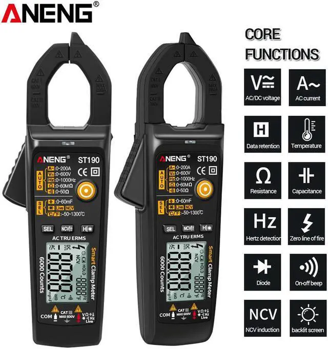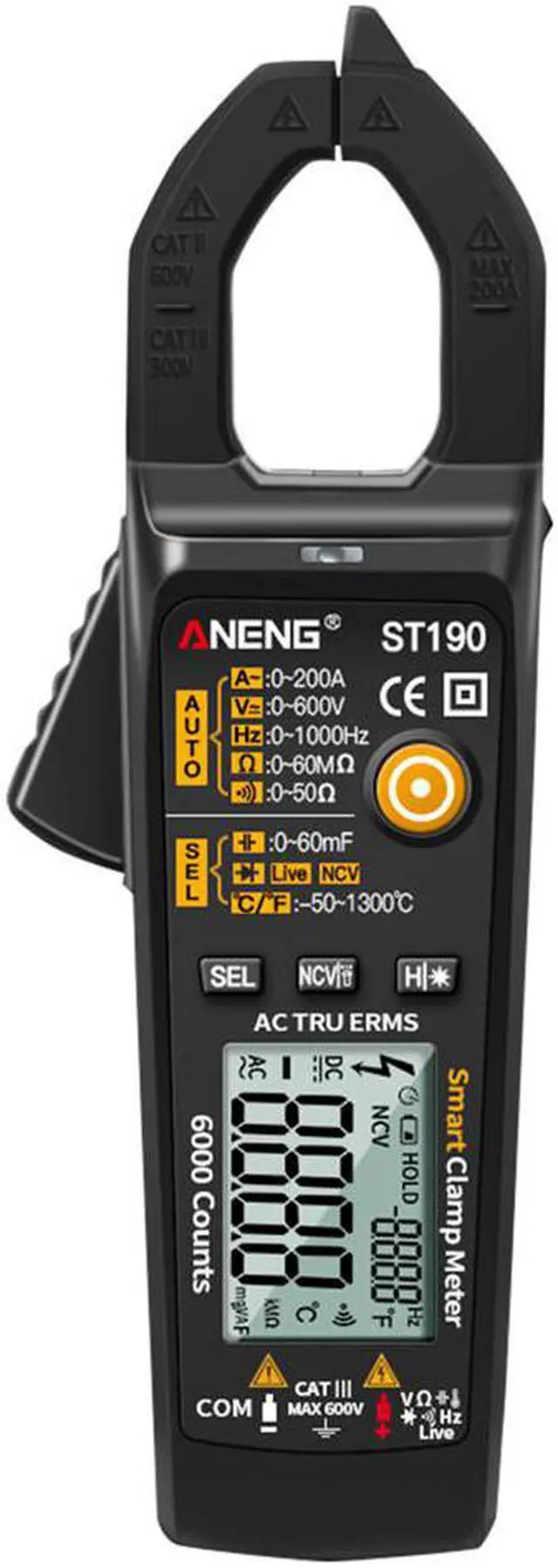 AC currentRange Resolution Accuracy60A 0.01A ( 2.5 % reading + 8 digits)200A 0.1ADC voltageRange Resolution Accuracy6V 0.001V ( 0.5 % reading + 3 digits)60V 0.01V 600V 0.1VAC voltageRange Resolution Accuracy6V 0.001V ( 0.8 % reading + 5 digits)60V 0.01V 600V 0.1VR esistanceRange Resolution Accuracy600 0.1 ( 0.8 % of reading + 3 digits)6k 0.001 k60k 0.01 k600k 0.1 k6M 0.001M 60M 0.01MC apacitanceRange Resolution Accuracy6nF 0.001 nF (10% reading + 40 digits)600nF 0.1 nF ( 2.5 % reading + 20 digits)6uF 0.001 uF60uF 0.01 uF600uF 0.1 uF6mF 1uF60mF 0.01 mFTemperatureRange Resolution Accuracy-50 - 1300 1 ( 1.0 %+3) reading-58 - 2372 1 ( 1.0 %+3) reading ST190 LCD Digital Automatic Current Clamp Meter DC AC Ammeter Voltage Voltmeter Ohmmeter Multimeter Resistance Ohm Temperature Tester Electrician ToolFeature: Automatic selection of measurement function and range. Full range overload protection.