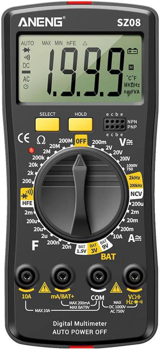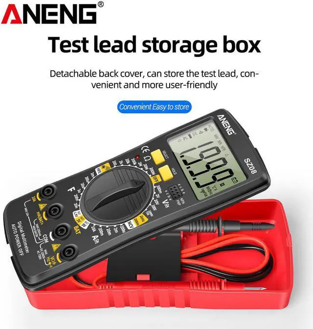 Description: Digital Multimeter LCD Professional Multimetro Auto Voltmeter Resistance Handhold Testers with Test LeadDigital multimeter tester is a multi-functional, auto-ranging digital multimeter with a 9999 counts LCD. When measuring, can tilt on the table, effectively support the digital multimeter tester, convenient standing operation measurement, check the value at any time. Lightweight, durable, no load-bearing. High-precision multimeter, multi-function measurement, removable back cover placement test lead.