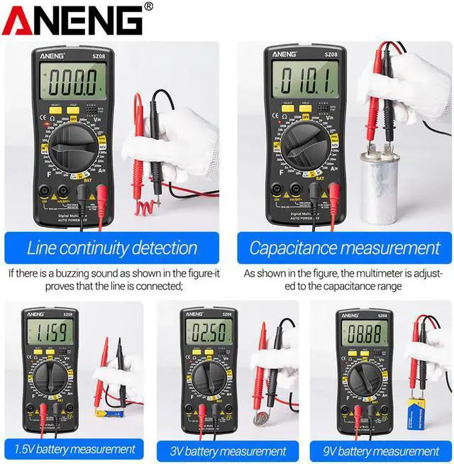 • Description:Digital Multimeter LCD Professional Multimetro Auto Voltmeter Resistance Handhold Testers with Test LeadDigital multimeter tester is a multi-functional, auto-ranging digital multimeter with a 9999 counts LCD.When measuring, can tilt on the table, effectively support the digital multimeter tester, convenient standing operation measurement, check the value at any time.Lightweight, durable, no load-bearing.High-precision multimeter, multi-function measurement, removable back cover placement test lead.