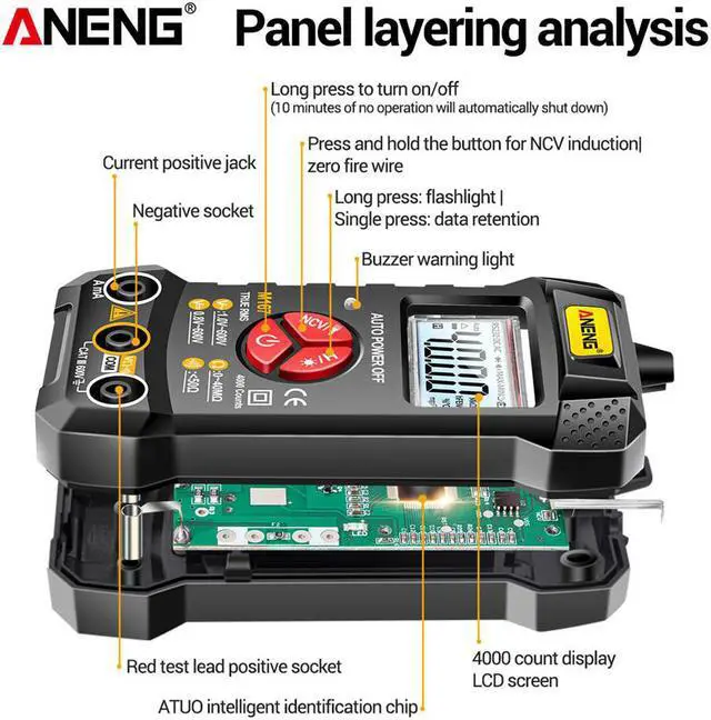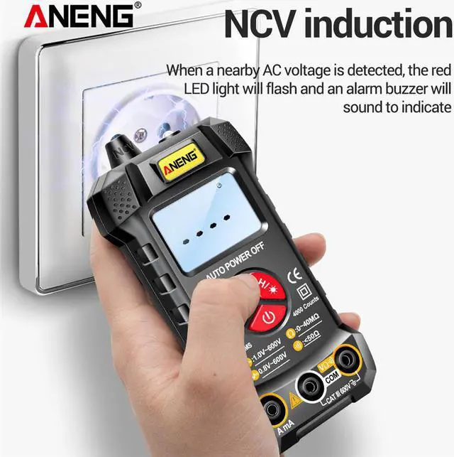 Description: Intelligent recognition of AC and DC voltage, automatic shifting, no shifting required. With true effective value and 4000 count display function, the measurement reading is more accurate. Common functions such as non-contact voltage detection, on-off buzzer, resistance measurement, data retention, automatic shutdown, low-power indication, etc. are complete. The high-definition backlight display can be used normally even in a dark environment, and the flashlight can be turned on for auxiliary lighting in a particularly dark environment.