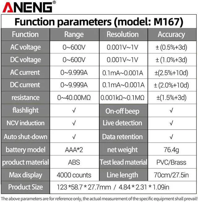 ANENG M167 Digital Mini Multimeter AC/DC Electrical Instruments Tester Auto Multimetro True Rms Transistor NCV Multi Meter(no box)