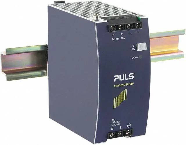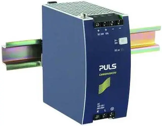 DC Power Supply, Input Voltage 100 to 120V AC, 200 to 240V AC, Output Voltage 24 to 28V DC, Power Rating 240W, Output Amps 10.0, Mounting DIN Rail, Switching, Case Material Metal Case, Height 124 mm, Width 60 mm, Depth 117 mm, Series Dimension, Hz 50 to 60 Hz, Phase - Electrical Single, Peak Amps 12, IP Rating 20, Output Noise 50mV, Hold Up Time 46 msec, Status Indicator LED, Features High Efficiency and Long Lifetime, Operating Temp.