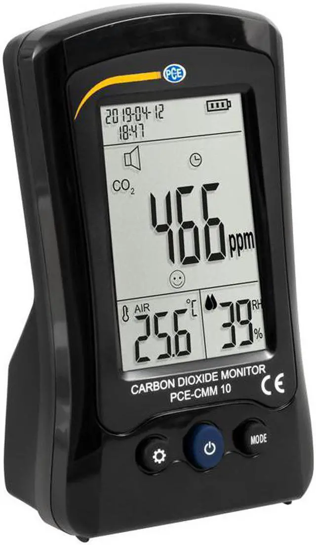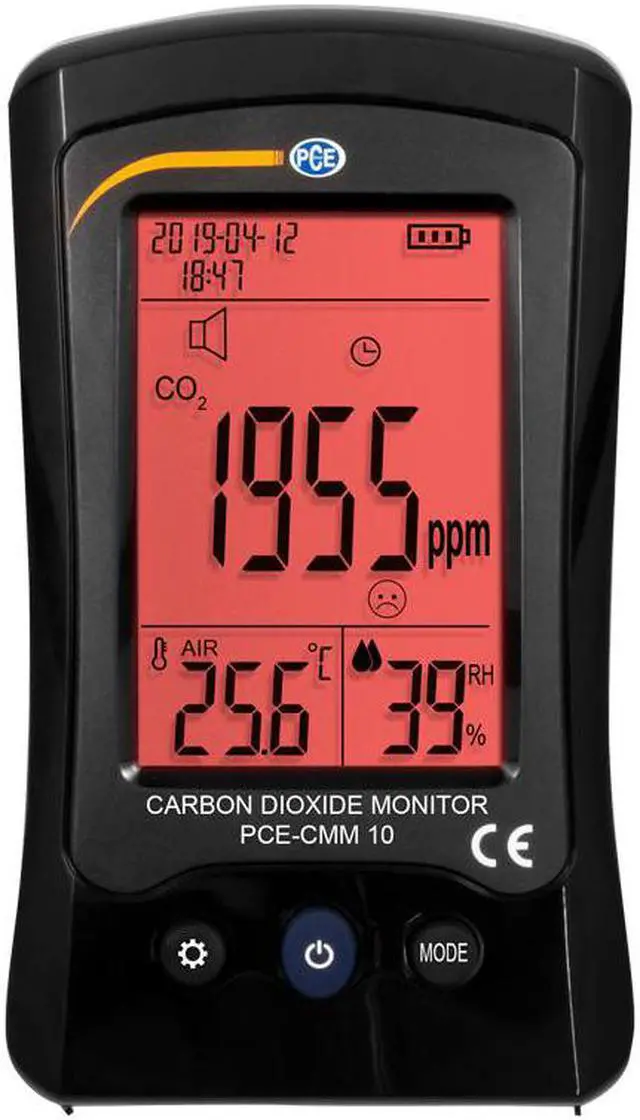 The CO2 measuring device PCE-CMM 10 is a multi-function measuring device for measuring the air quality. This CO2 meter measures synchronously the CO2 concentration, the air temperature and the humidity. In addition, the CO2 meter has permanently programmed alarm limits. As soon as the currently measured CO2 measured value exceeds the alarm limit, the alarm is activated. The user is alerted to the CO2 meter by an audible and visual signal.