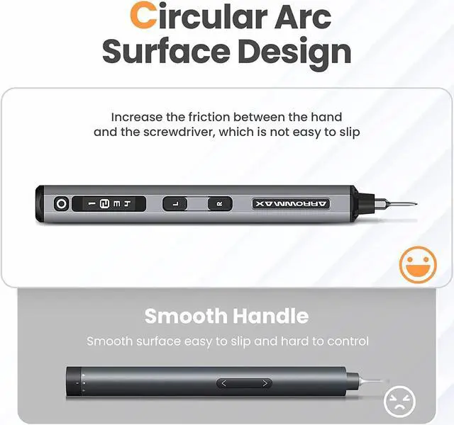 Circular Arc Surface Design - SES Electric Screwdriver handle adopts a square shape with a circular arc surface, making it better to control the mini electric screwdriver during work and the grip is more comfortable. The pen-shaped body is ergonomically designed and easy to grasp. The circular arc surface allow arthritic hands to grasp without fatigue.