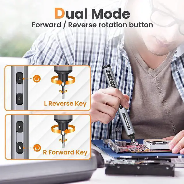 4 Adjustable Torque & Dual Mode - SES Power Screwdriver has a high and low electric torque of 0.049 N. m - 0.20 N. m and a manual torque of 3 N. m. Buttons for forward and reverse of power screwdriver are clearly marked. Dual mode meet your requirement of tightening or loosening screw bits.