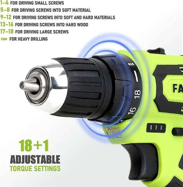 The cordless drill set is powered by a max powerful 20-Volt, 1.5AH Lithium-ion battery for enough power for a full range of applications. It features a 3/8 in. keyless chuck with a 19-position clutch adjusts torque output to control the depth of the screw or fastener. The drill is designed with variable 2-speed settings (0-400 rpm and 0-1500 rpm) for multiple purposes.