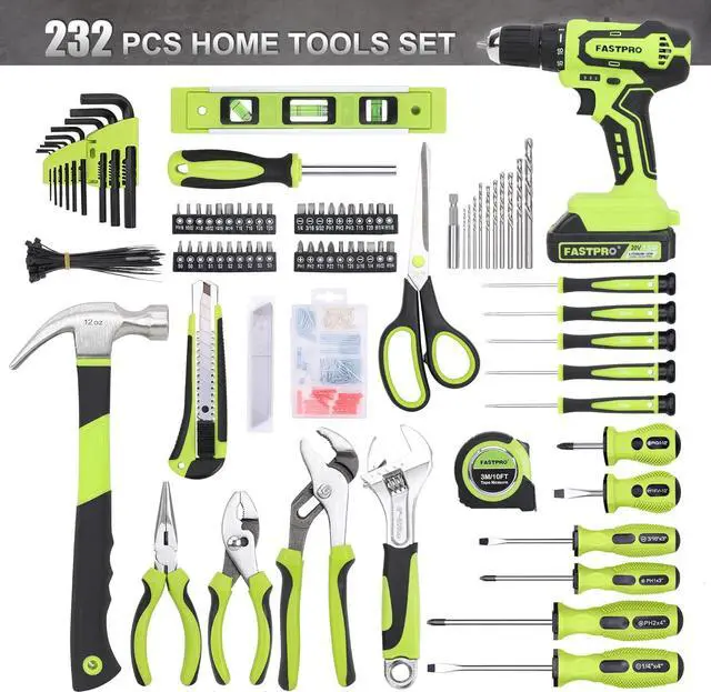 232-Piece 20V Cordless Lithium-ion Drill Driver and Home Tool Set, Household Repairing Tool Kit with Drill, 12-Inch Wide Mouth Open Storage Tool Bag, Green