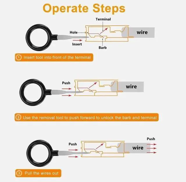 Easy to Use: The electric pin remover tool is easy to use, just push and pull the terminal pins with the connector removal tool for removal effortlessly from the wire harness connectors without any damage.